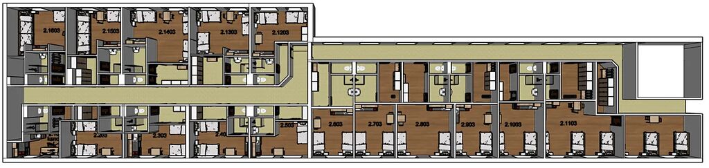 36 lidí. Ubytovna je rozdělena na 2 části – část s 9 pokoji a část se 6 pokoji. Velikost pokojů je od 24 m² do 36 m². Každá část má vlastní vstup se schodištěm, ale zároveň jsou vzájemně propojeni společnou chodbou. Preferujeme pronájem ubytovny jako celku, nebo možnost pronájmu buďto 9 pokojů nebo 6 pokojů. Jednotlivé pokoje pronajímat nelze. Ideální místo pro ubytování firemních zaměstnanců v čistém a příjemně zařízeném prostředí. Ubytovna ještě nebyla obývána.