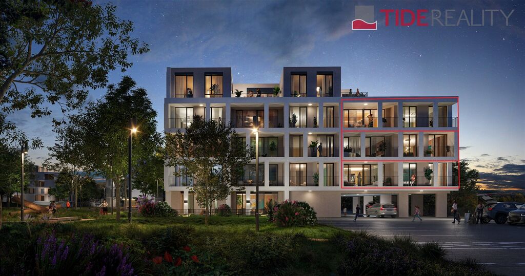 Tento konkrétní byt o podlahové ploše 98,5m2 s terasou 19m2, se bude nacházet ve 2.NP pětipodlažní budovy se 14 bytovými jednotkami. Má velmi příjemnou orientaci na jih a západ. V rámci jeho navržené dispozice 4+kk jsou možné 2 varianty řešení. Typově shodný byt je k dispozici i v jiných budovách a vyšších podlažích.