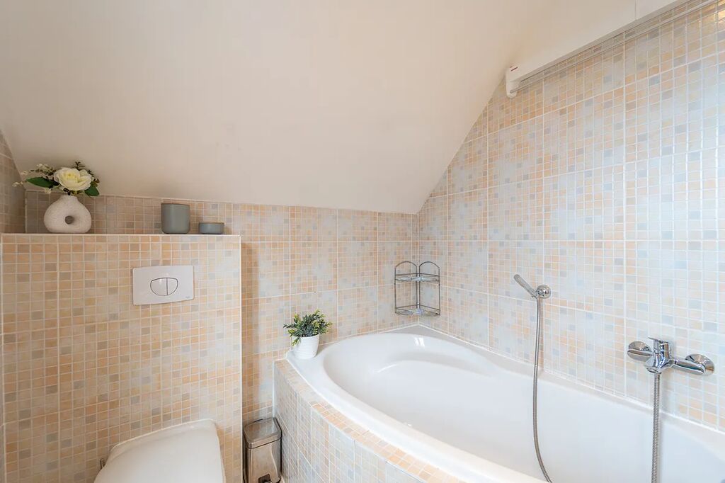 Druhá koupelna s vanou a toaletou (5,72 m2) doplňuje komfort celého patra. V koupelně radiátor a topný žebřík.