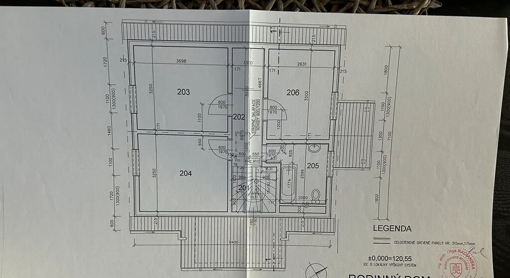 V patře domu se nachází tři pokoje, šatna a druhá koupelna s vanou a toaletou.