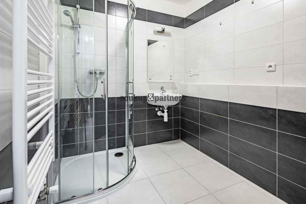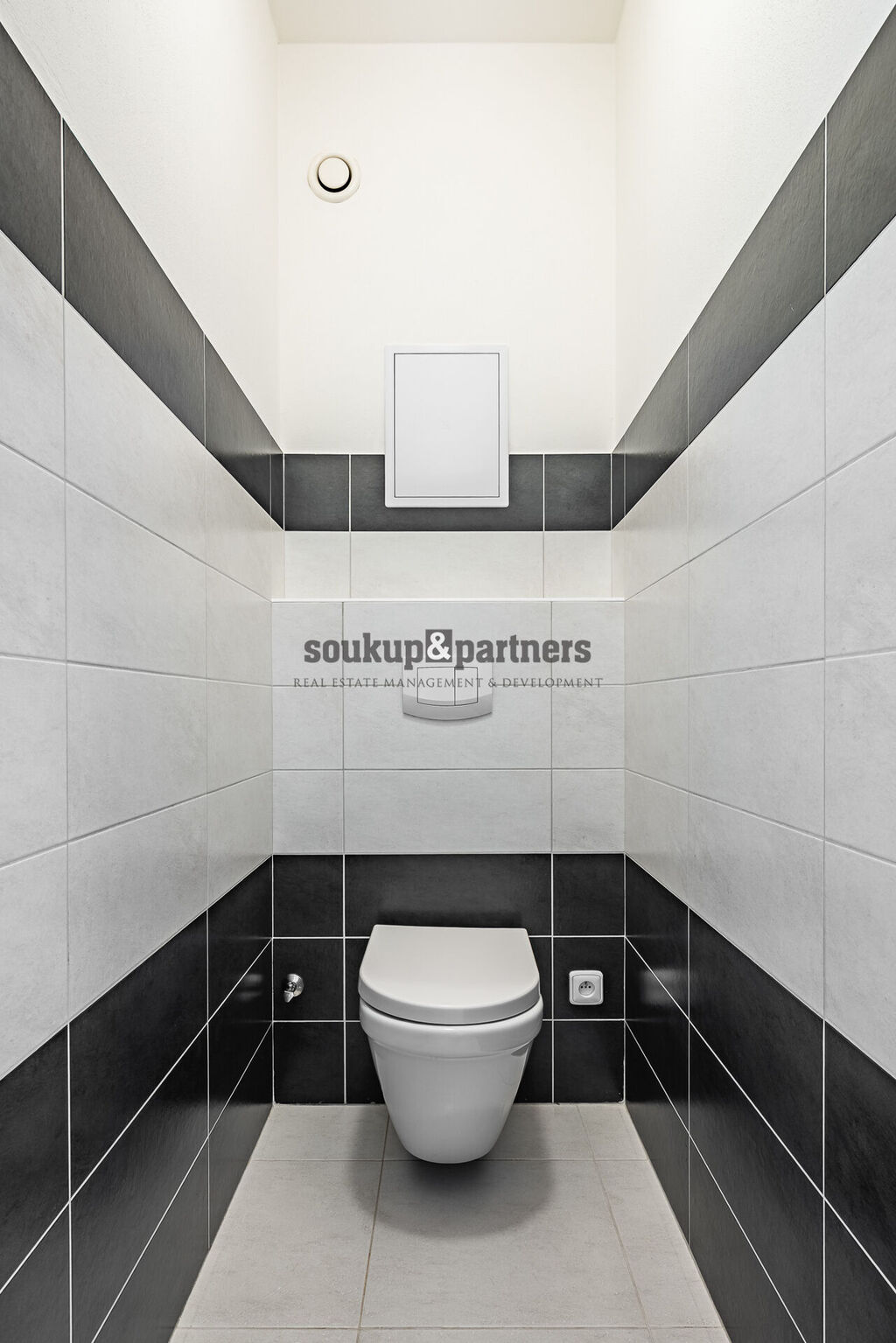 Byt je vybaven koupelnou se sprchovým koutem a podlahovým vytápěním. Koupelna nabízí dostatek místa pro pračku i sušičku, případně další úložné prostory. Toaleta je samostatná.