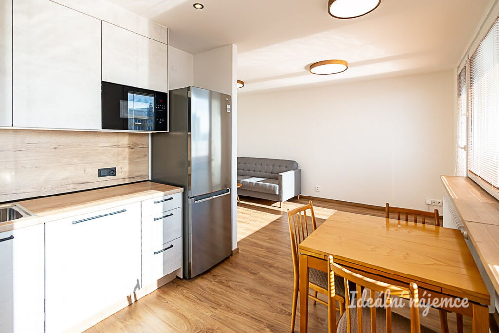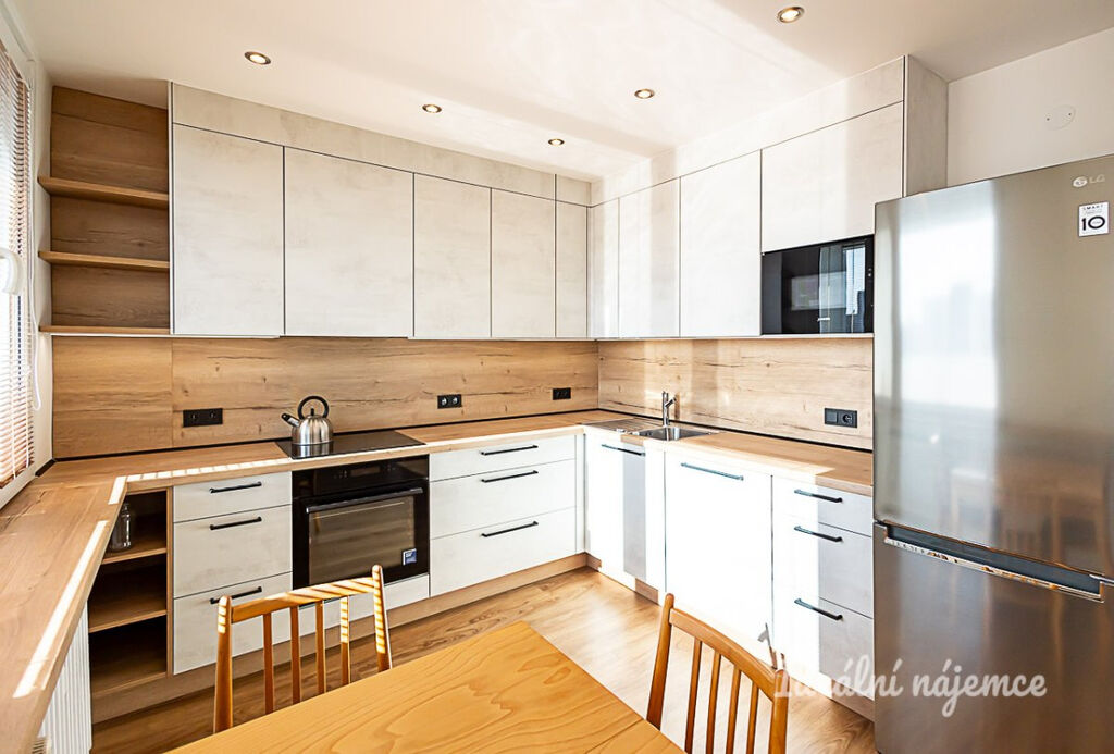 Obývací pokoj je spojený s novou kuchyní na míru, kde naleznete indukční varnou desku, elektrickou troubu, mikrovlnnou troubu, lednici s mrazákem, myčku a dostatek úložného prostoru. Z obývacího pokoje je vstup přímo na prostornou prosklenou lodžii. Obě ložnice jsou neprůchozí. Okna bytu jsou orientovaná na dvě světové strany, ze všech oken je výhled do zeleně.