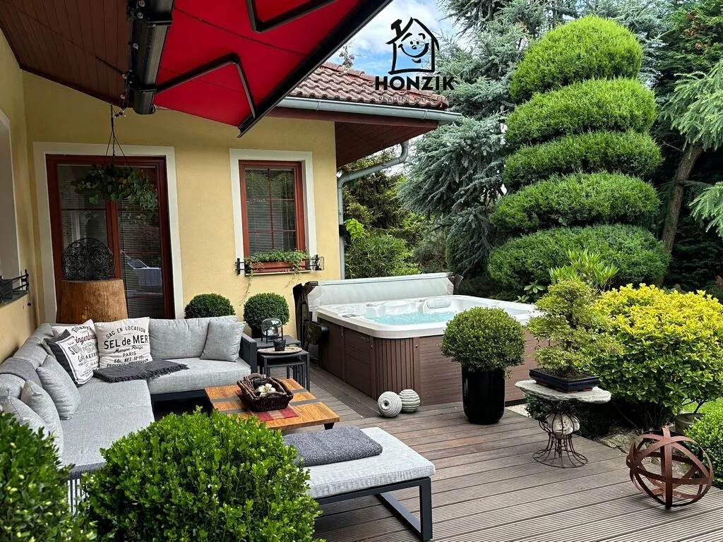 Nabízíme na prodej krásný, samostatně stojící rodinný dům z roku 2001 o dispozici 4+1 s jídelnou, zimní zahradou, terasou a překrásnou vzrostlou zahradou v Zahořanech u Mníšku pod Brdy. Dům je přízemní s čistou obytnou plochou 121 m2 (bez teras a zimní zahrady), je postaven na pozemku o výměře 1140 m2, v klidné lokalitě v zástavbě rodinných domů a vil. Je velice dobře dispozičně řešen, obývák s krbem je propojen s prostornou kuchyní a jídelnou, pokoje jsou vesměs neprůchozí, má dostatečně velkou koupelnu i komoru a přes terasu s markýzou, posezením a novou výřivkou, je prakticky propojen se zahradou. Kuchyň je vybavena veškerými spotřebiči. Dům je napojen na veškeré inženýrské sítě - elektro, vodovod a kanalizace, kromě plynu. Vytápění a ohřev vody zajišťuje tepelné čerpadlo z roku 2020. Koupelna a toaleta má podlahové teplovodní vytápění a je po rekonstrukci v 2020. Parkování pro dvě auta je řešeno zastřešeným parkovacím stáním. Zahrada je nádherná, udržovaná a již se vzrostlými stromy, jinými keři a rostlinami a nachází se na ní také zahradní jezírko. Dům splňuje předpoklady moderního, pohodlného a energeticky nenáročného bydlení. Velmi klidná a žádaná lokalita v čistém prostředí s dobrou dostupností Prahy (Smíchovské nádraží a metro cca 30 min.) s dostupností všech potřebných služeb v nedalekém Mníšku pod Brdy nebo v Praze.