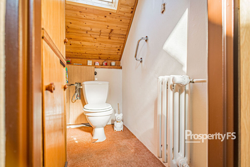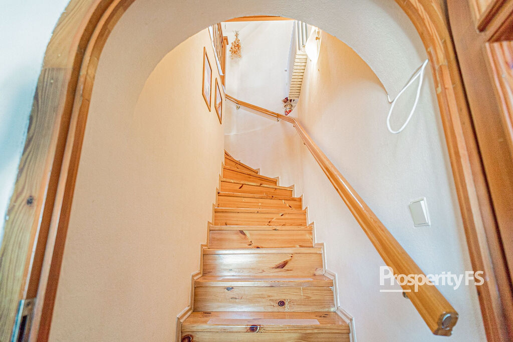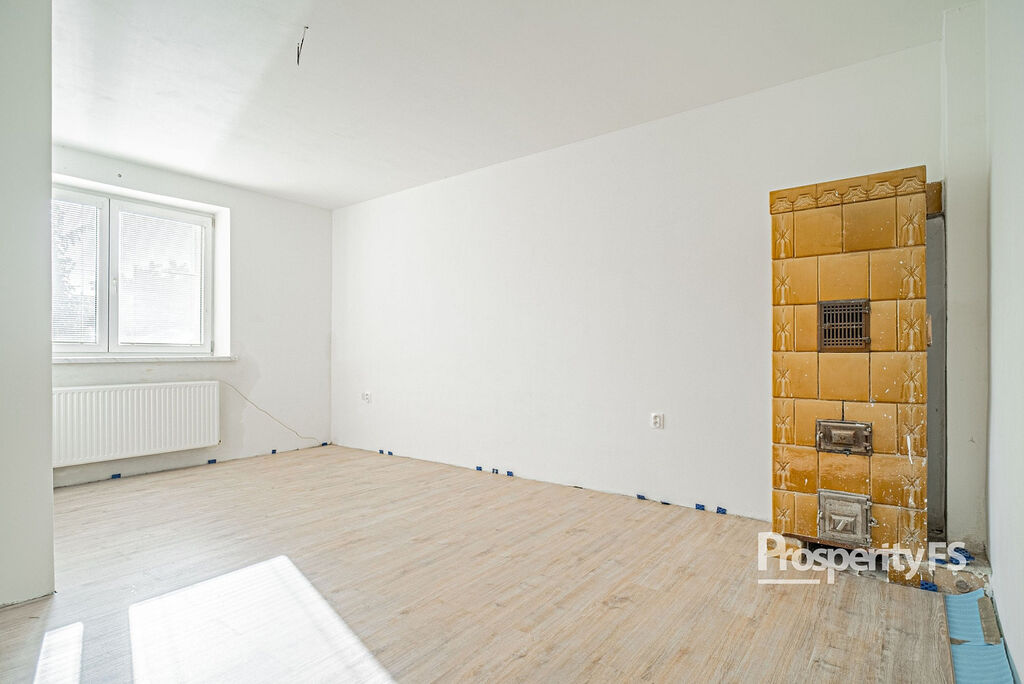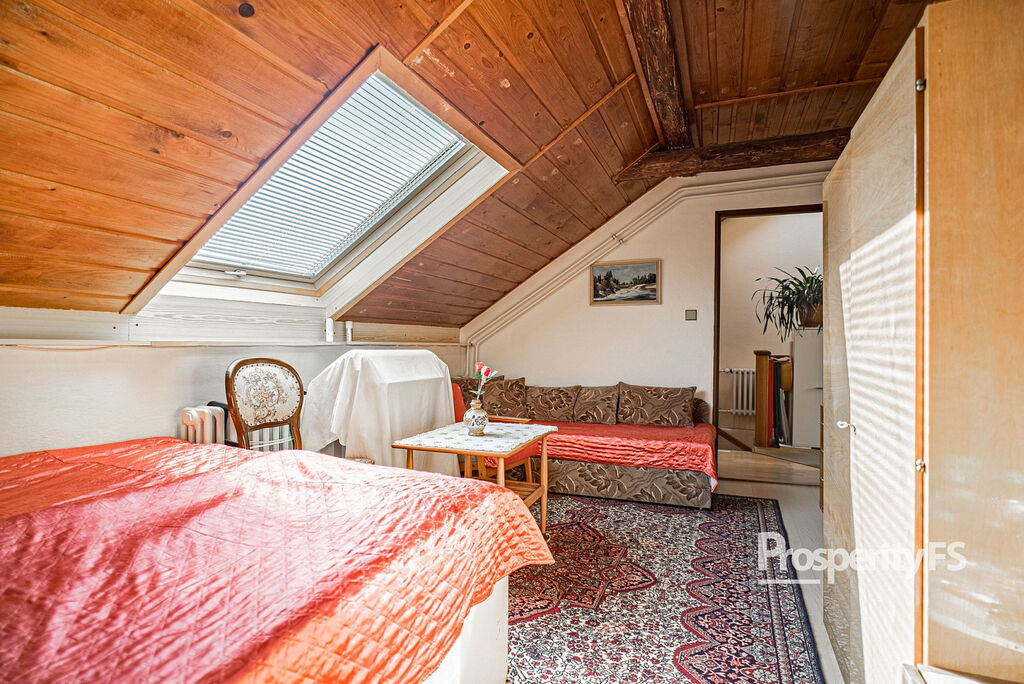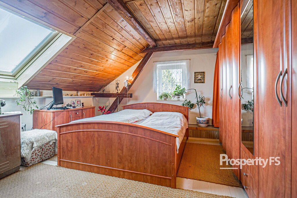 V patře najdete bytovou jednotku 3+1 s velkým obývacím pokojem vybaveným kamny a balkonem, dvěma neprůchozími prostornými ložnicemi, kuchyní, samostatnou koupelnou a WC. K dispozici je také půdní prostor.