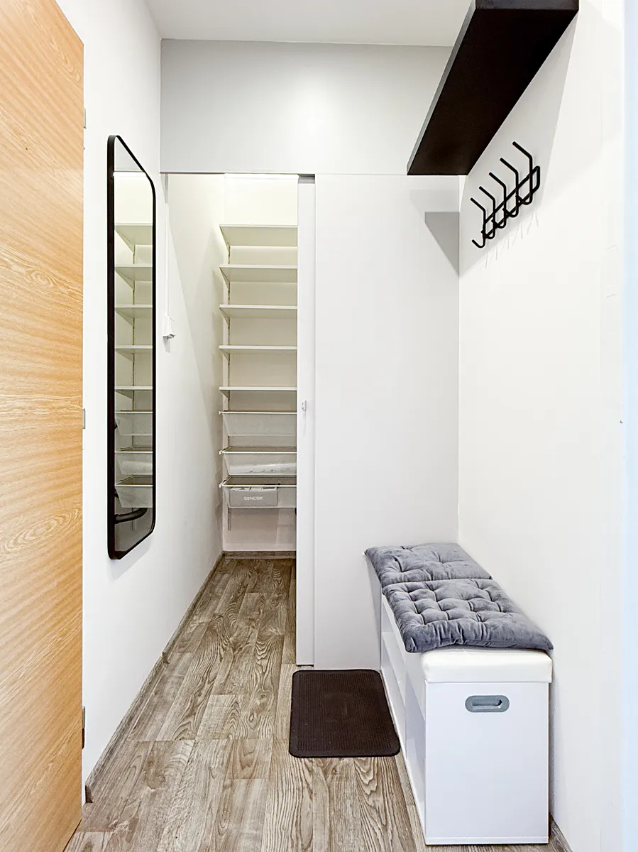 Byt disponuje ložnicí s manželskou postelí a komodou, obývacím pokojem se sedačkou, konferenčním stolkem a psacím stolem. Kuchyně je plně vybavena všemi potřebnými spotřebiči. Chodba je prakticky řešena a nabízí prostornou šatnu. Koupelna je v původním stavu a je vybavena sprchovým koutem a WC.