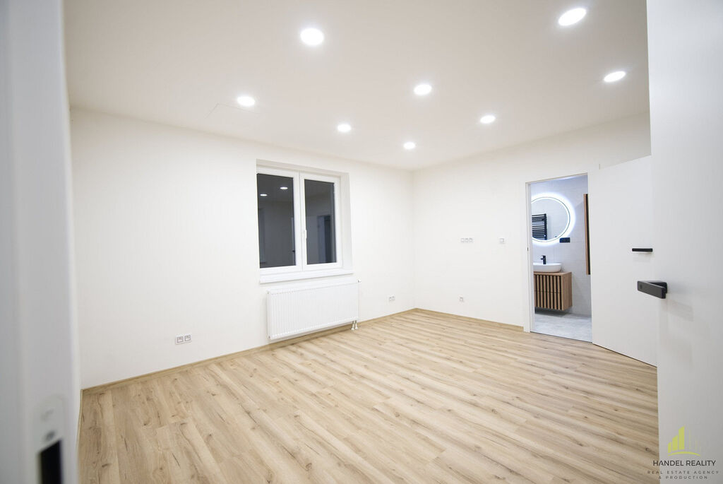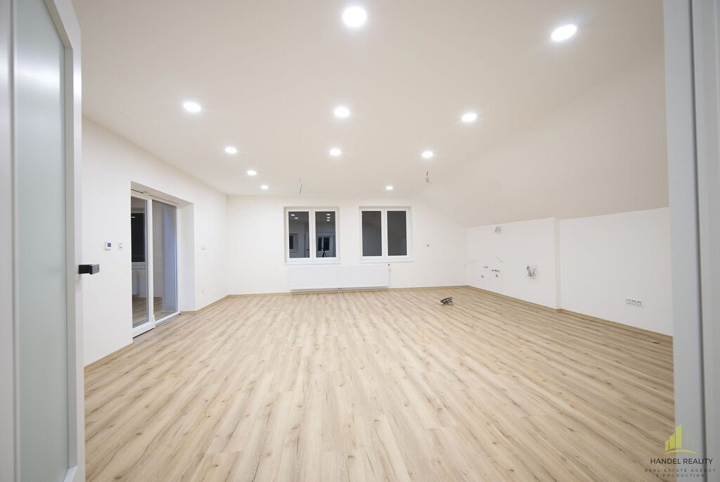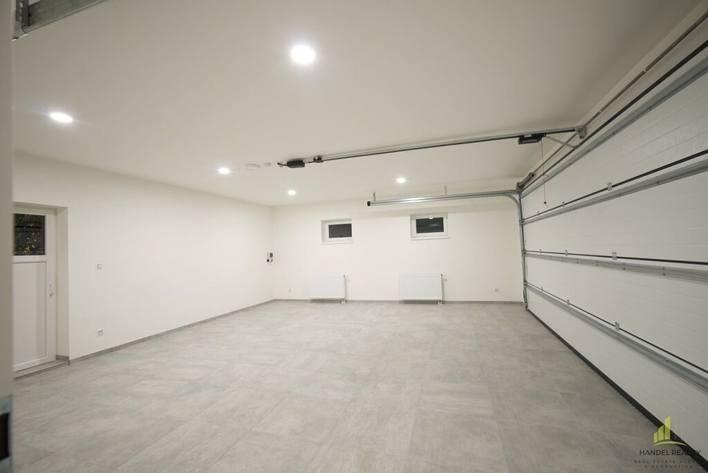 V přízemí se nachází prostorný obývací pokoj s kuchyňským koutem o velikosti přibližně 50 m², který je připraven k dokončení podle představ nového majitele. Z obývací části je přímý vstup francouzskými dveřmi do atria a zahrady. Na stejném podlaží jsou také dva samostatné pokoje, každý s vlastní koupelnou a toaletou, díky čemu se nabízí praktické řešení pro pracovnu, dětský pokoj nebo prostor pro návštěvy. V přízemí nechybí ani prostorná technická místnost a garáž o rozloze téměř 46 m², kde je dostatek místa nejen pro parkování, ale i pro úložné prostory nebo dílnu pro kutily.