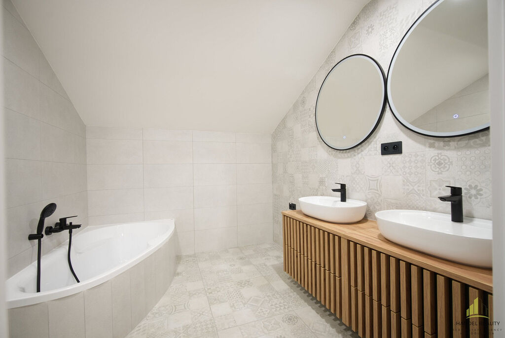 V patře jsou umístěny další dva velké pokoje, technická místnost a koupelna. Větší pokoj má téměř 50 m² a díky své velikosti i přípravě na kuchyňský kout může sloužit jako samostatná bytová jednotka. Dům tak nabízí pohodlné vícegenerační bydlení nebo komfortní zázemí pro hosty. Druhý pokoj o velikosti přibližně 37 m² je světlý a prostorný, s možností rozdělení příčkou na dvě menší místnosti. Oba pokoje mají přímý vstup na terasy s krásnými výhledy do okolní krajiny. Terasy jsou obloženy modřínovým dřevem, které je nejen estetické, ale i mimořádně odolné vůči povětrnostním vlivům, takže časem získává jen přirozenou patinu. U vstupu na terasy je podlahové vytápění, díky kterému zůstává prostor příjemně temperovaný i při otevřených dveřích.