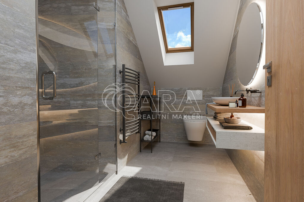 •. Podkroví (68 m²): 3 prostorné pokoje, koupelna/WC, komora + terasa s výhledem.