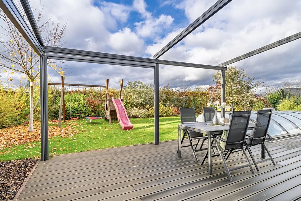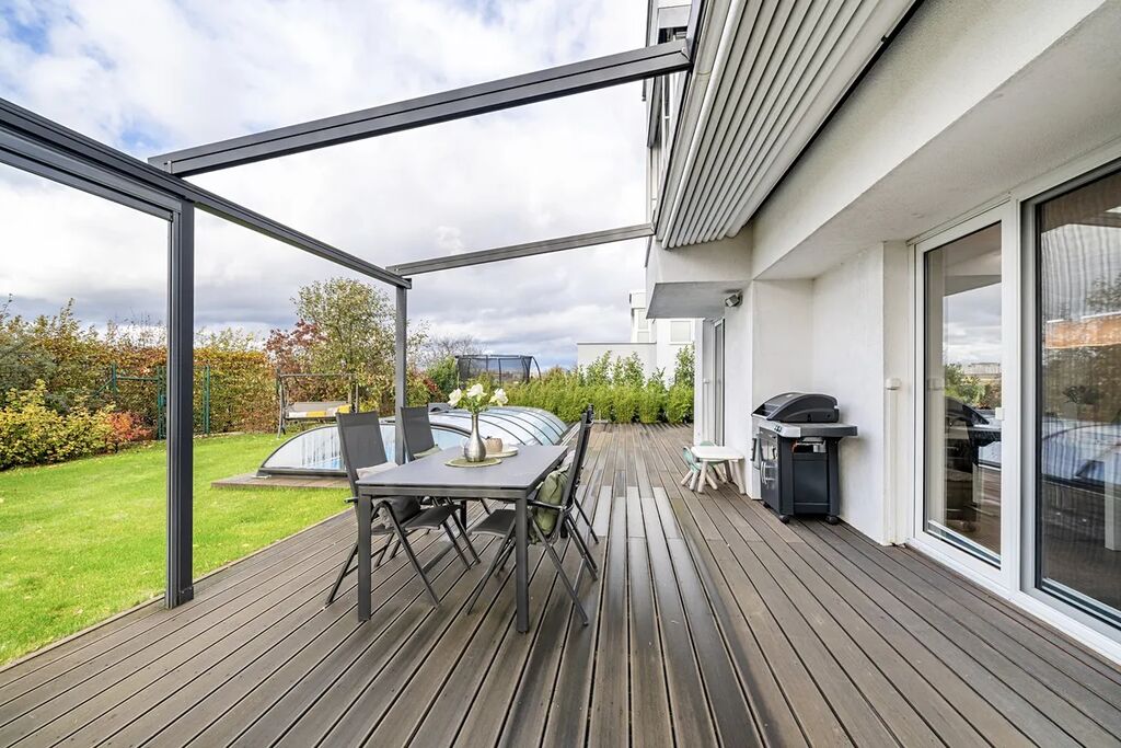 Udržovaná zahrada s terasou s hliníkovou pergolou s integrovaným stíněním a LED osvětlením, kde je dominantou úplně nový vyhřívaný bazén s protiproudem.