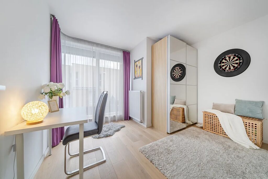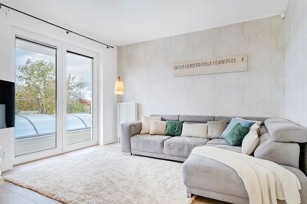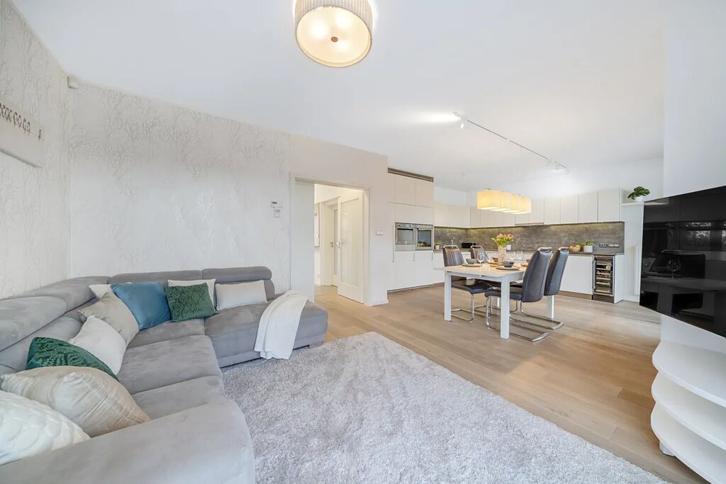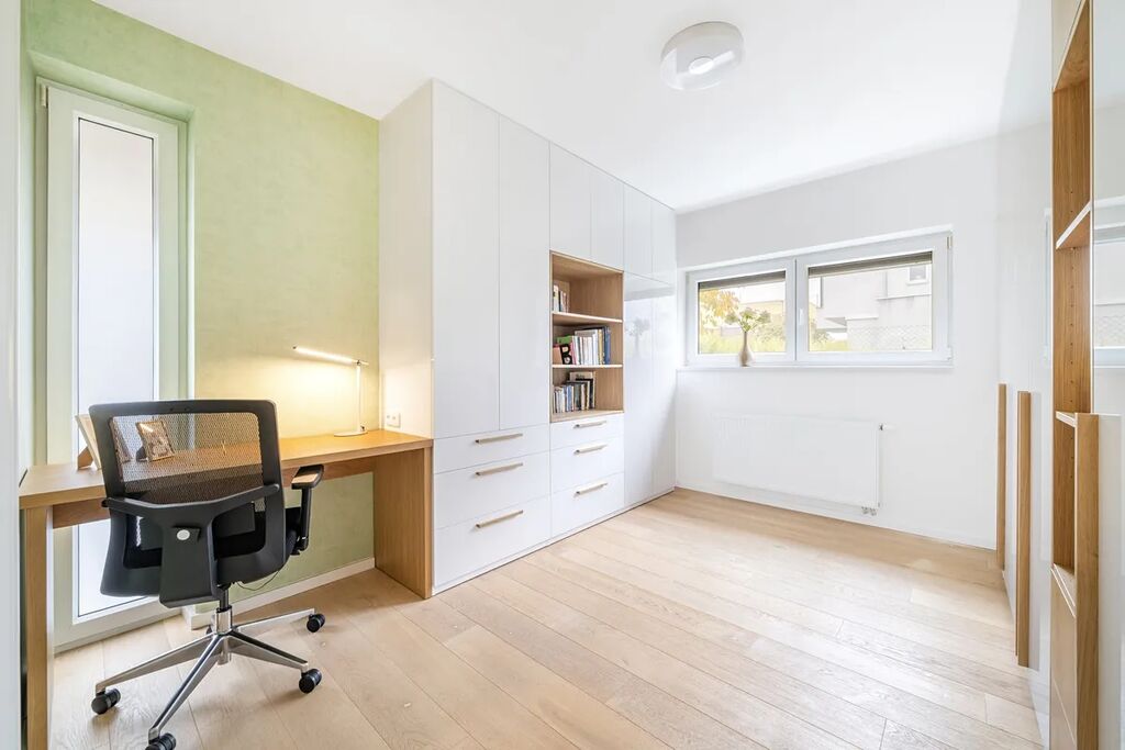 Dubové podlahy (dub bělený, kartáčovaný), kuchyňská linka na míru s obklady Egger (beton) a vestavěnými elektrickými spotřebiči. Nábytek na míru také v ostatních místnostech, posuvné interiérové dveře se zrcadlem a další.
