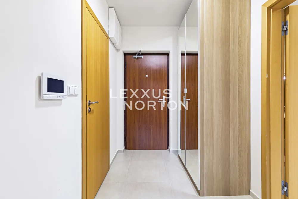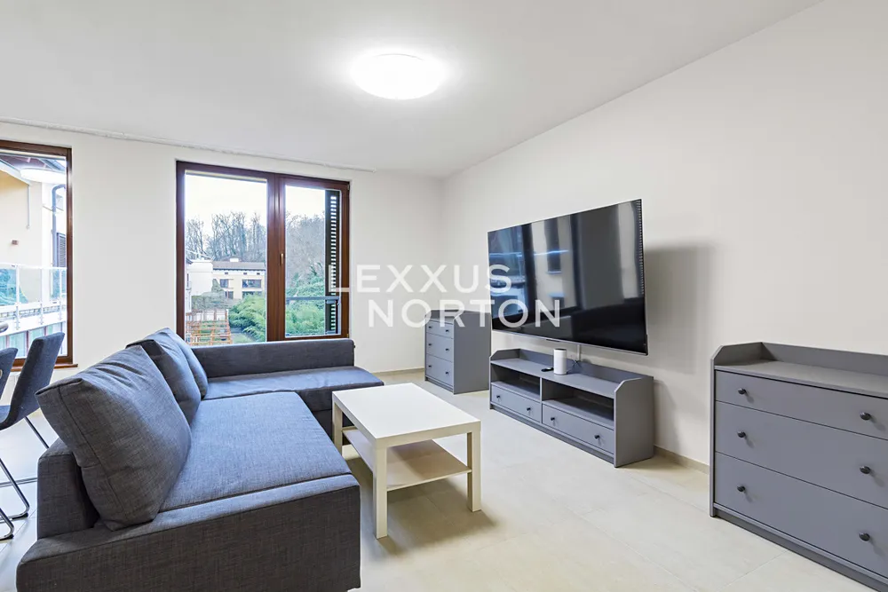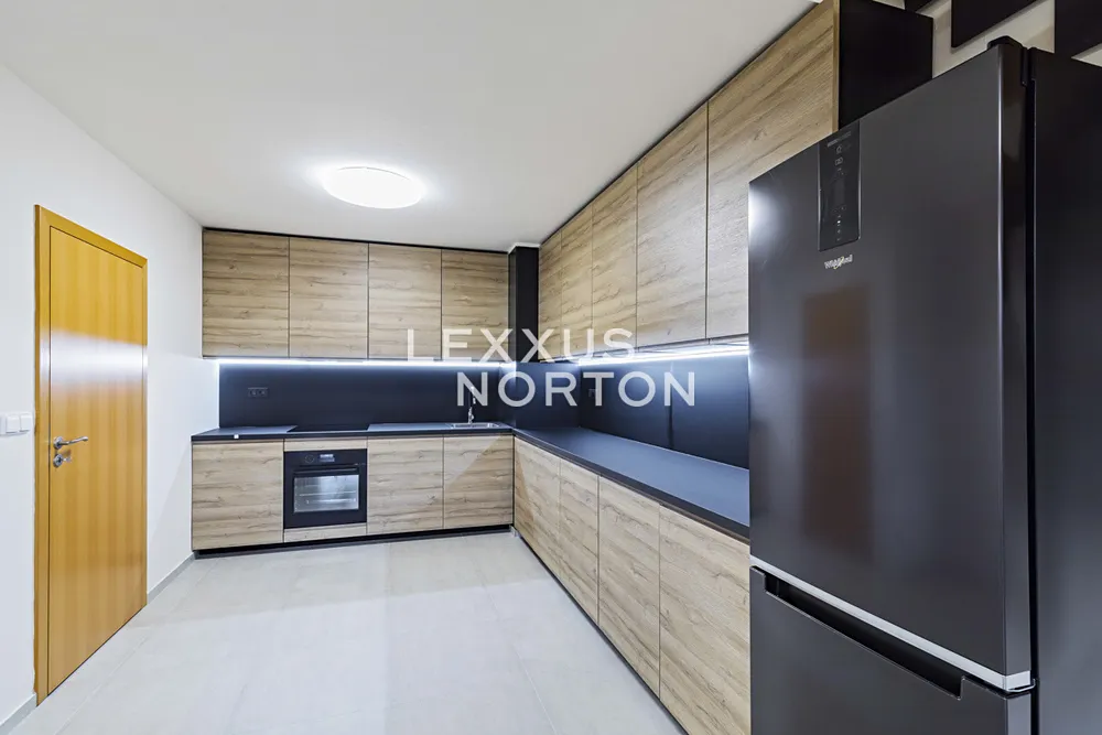 Byt je zařízený a je vybavený kuchyňským koutem včetně spotřebičů (indukční deska, trouba, lednice, mrazák a myčka nádobí), 2 koupelny - jedna se sprchovým koutem a druhá s vanou, sedací souprava, postel, televizní stolek a televize. K vybavení domu patří společné fitness a také sauna.
