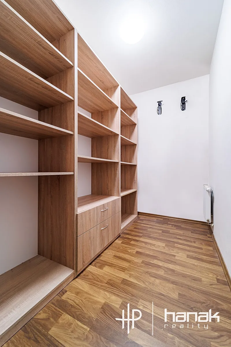 Dispozice bytu nabízí zádveří s úložným prostorem, oddělenou toaletu, koupelnu s vanou, umyvadlem a místem pro pračku se sušičkou. Z chodby je dále vstup do praktické šatny, velké pracovny - kterou je možné využívat i jako pokoj a do ložnice s manželkou postelí a vestavěnou skříní.