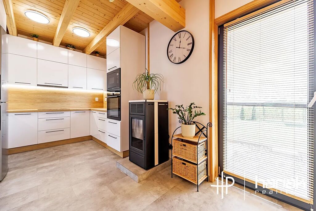 Dominantou přízemí je vkusně laděný obytný prostor v kombinaci se dřevem, což umocňuje jeho útulnou atmosféru a čistotu prostoru v duchu minimalismu. Je zde dostatek místa pro moderní kuchyňskou linku s vestavěnými spotřebiči a výhledem do zahrady, jídelní kout s obývací částí disponuje výstupem na terasu.