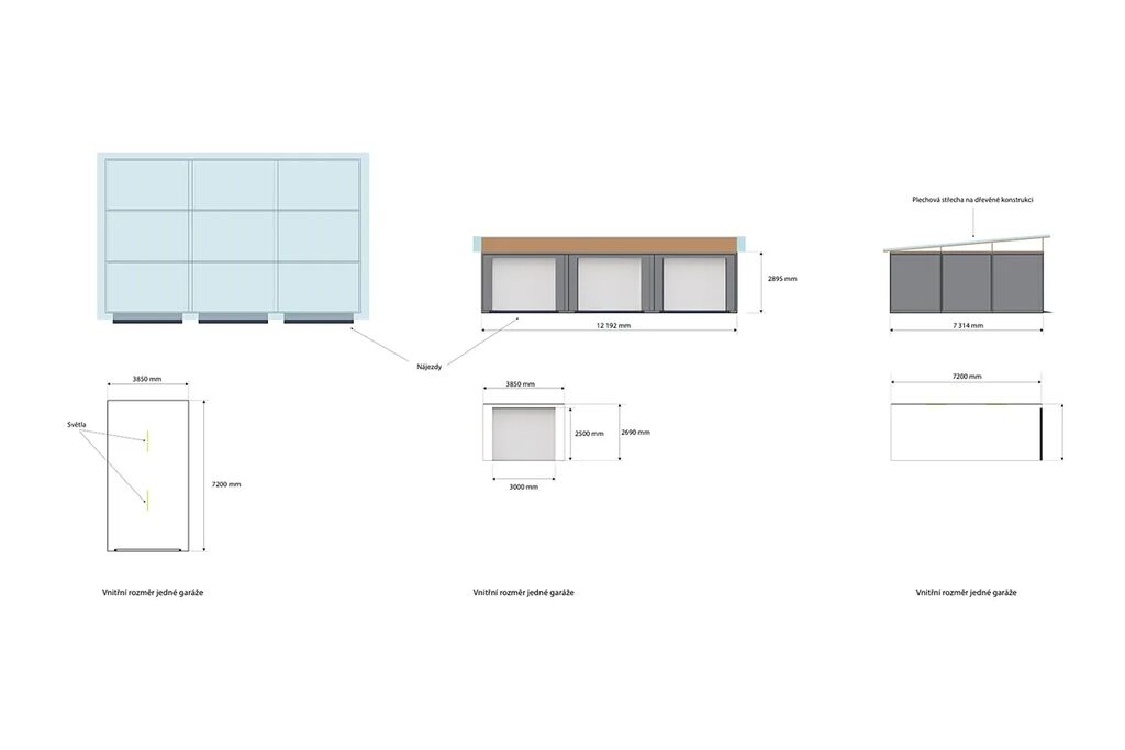 Rozměry garáže 3,8 m šířka a 7,2 m délka. Výška stropu je 2,69 m. Podlahová plocha 27 m2. Vjezd do garáže je přes dálkově ovládaná sekční vrata s rozměry 3 m šířka a 2,5 m výška.