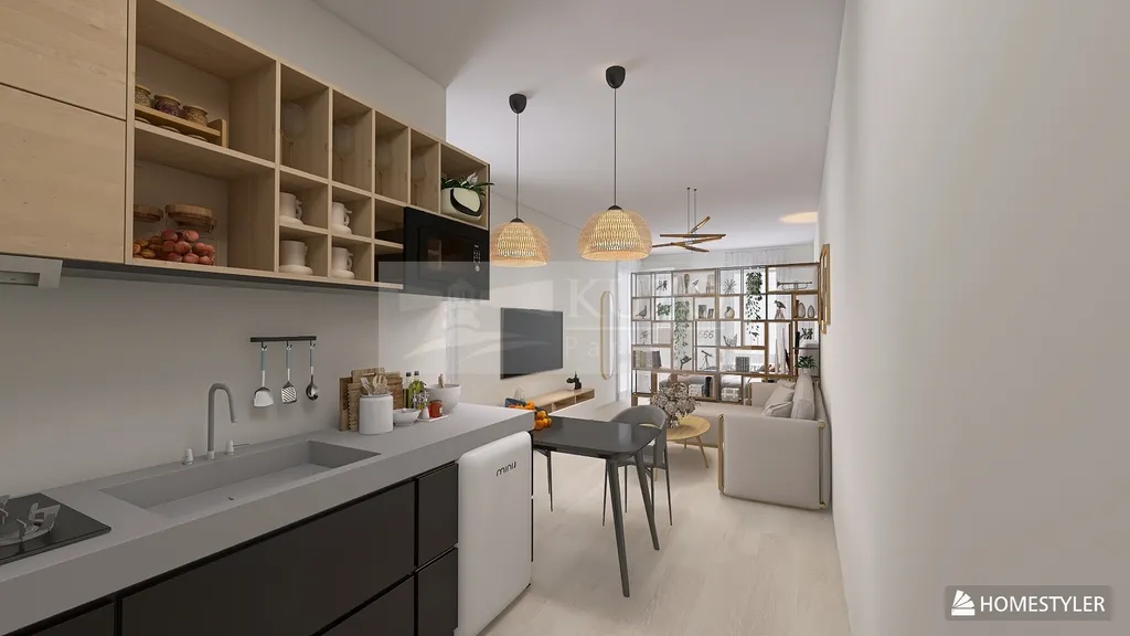 Dispozice nabízí prakticky řešený obytný prostor s kuchyňským koutem vybaveným myčkou, lednicí, mikrovlnnou troubou, dvouvařičem a troubou. Koupelna je spojena s WC.
