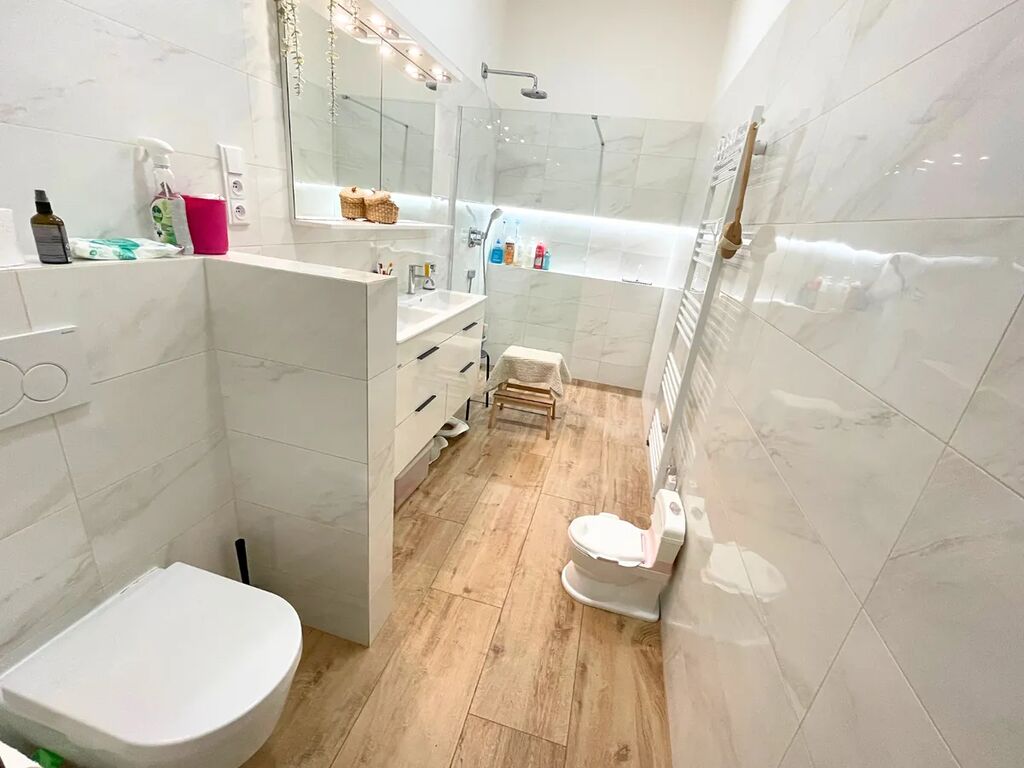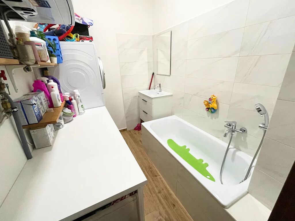 Byt má dvě koupelny - jednu s vanou a pračkou a druhou se sprchovým koutem a toaletou. Dále je k dispozici na chodbě samostatná toaleta.