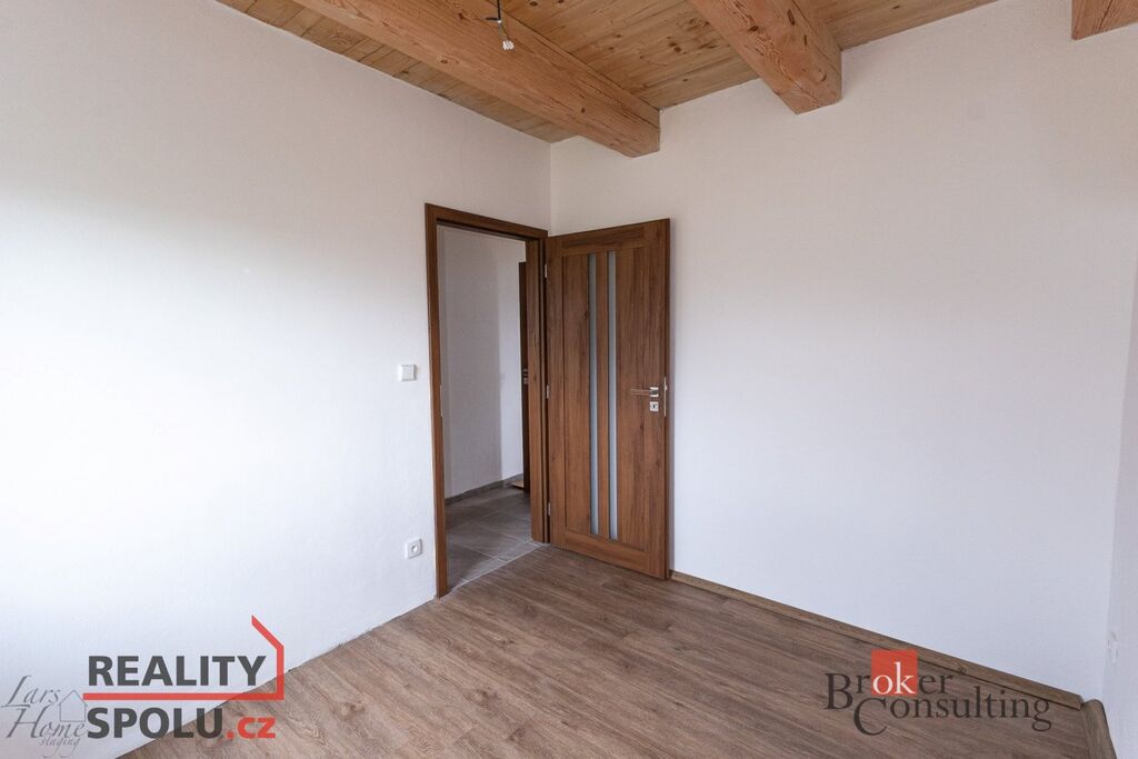 Rodinný dům se skládá ze dvou podlaží. Přízemí je již dokončené, najdete zde prostorný obývací pokoj s přípravou na kuchyni, dále přímý vstup na zahradu, dvě ložnice, koupelnu a toaletu. Díky dřevěným stropním trámům působí interiér velmi příjemně. V patře je připraven rozsáhlý podkrovní prostor, kde máte jedinečnou příležitost si dokončit dům dle svého uvážení.