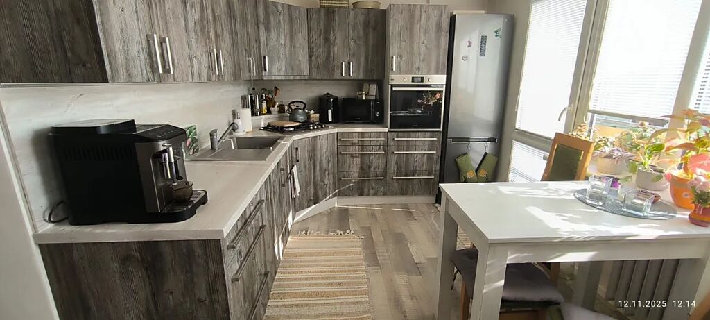 V kuchyni je rohová kuchyňská linka na míru včetně vestavěných spotřebičů varná deska, horkovzdušná trouba, digestoř, myčka, volně stojící lednice s mrazákem.