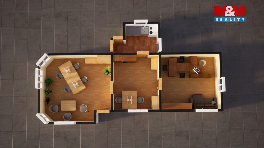 Dispozice tvoří tři samostatné místnosti, které lze využít jako kanceláře, zasedací místnost nebo zázemí pro klienty.