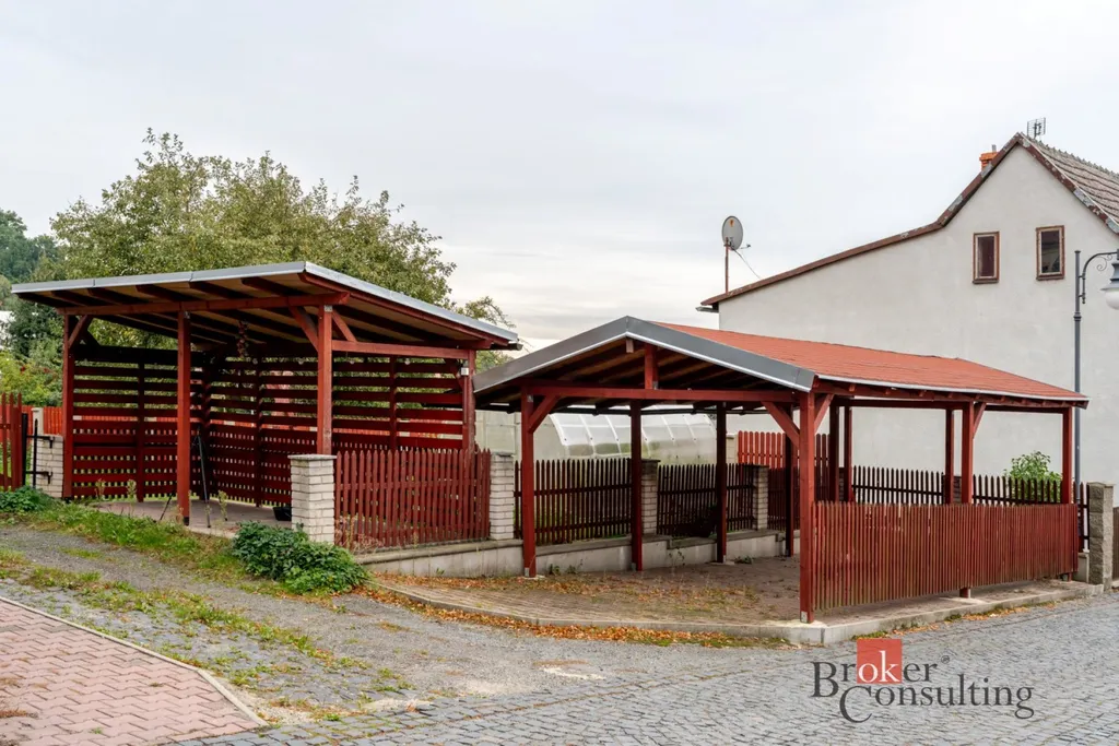 Na rovinatém a uzavřeném pozemku se nachází velká pergola a prostorné garáže s vysokými stropy, které lze využít jak pro parkování, tak pro dílnu, sklad nebo další zázemí. Další dvě nové pergoly jsou mimo uzavřený pozemek, dříve sloužili, jako přístřešek pro hosty.