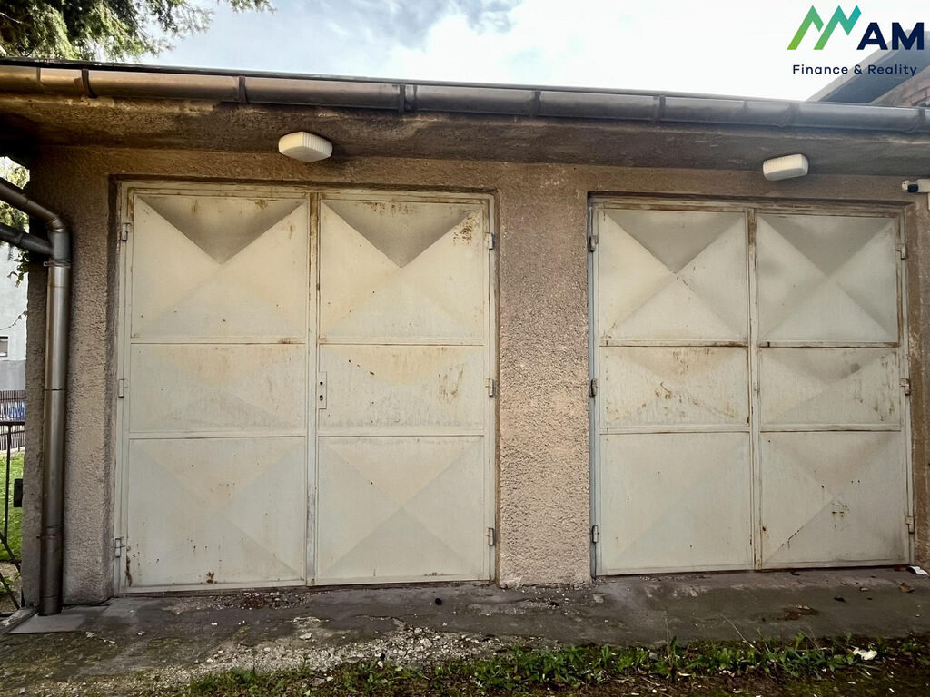 Dvojgaráž s velkými vraty, vhodná i pro větší auta, byla postavena v 90. letech. Přístup k ní je ze zahrady, zatímco vjezd pro auta je z druhé strany po asfaltové příjezdové cestě. Tato prostorná místnost může být vytápěna pomocí kotle na tuhá paliva, který je umístěn v oddělené místnosti, a teplo je rozvedeno radiátory, což z ní činí příjemný prostor pro dílnu. V garáži se nachází také umyvadlo s užitkovou vodou a půdní prostor nabízí další možnosti pro uskladnění věcí.