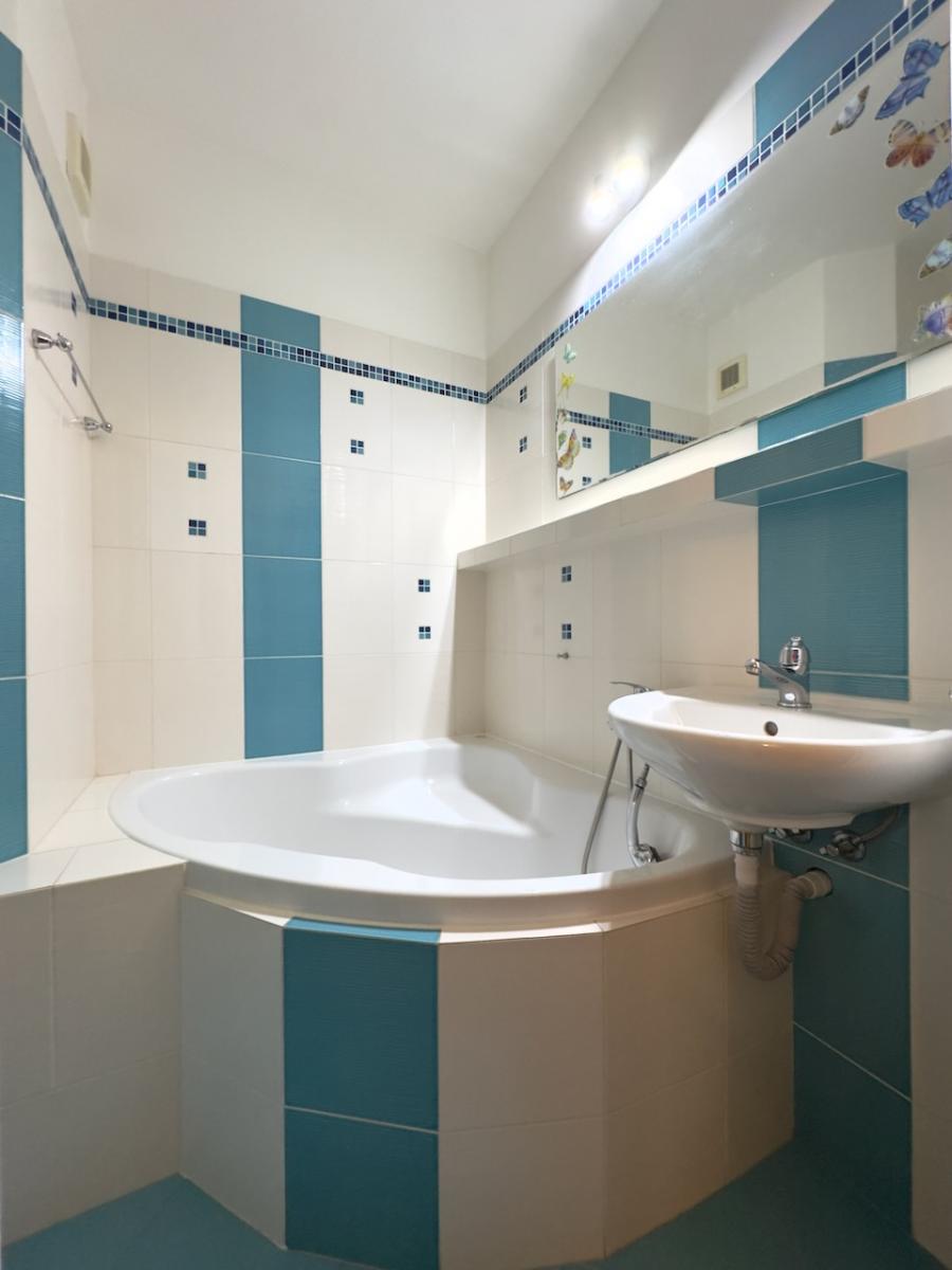 Koupelna: Umyvadlo se zrcadlem, rohová vana, WC