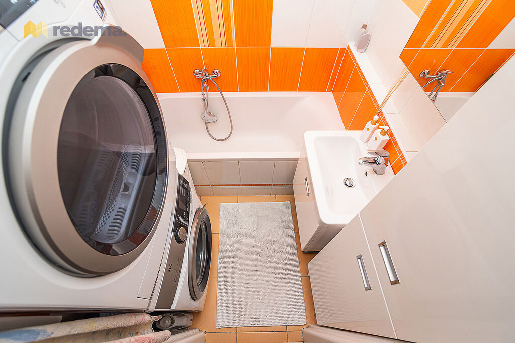 - oddělená koupelna s vanou, pračkou i sušičkou ~ 3,2 m²