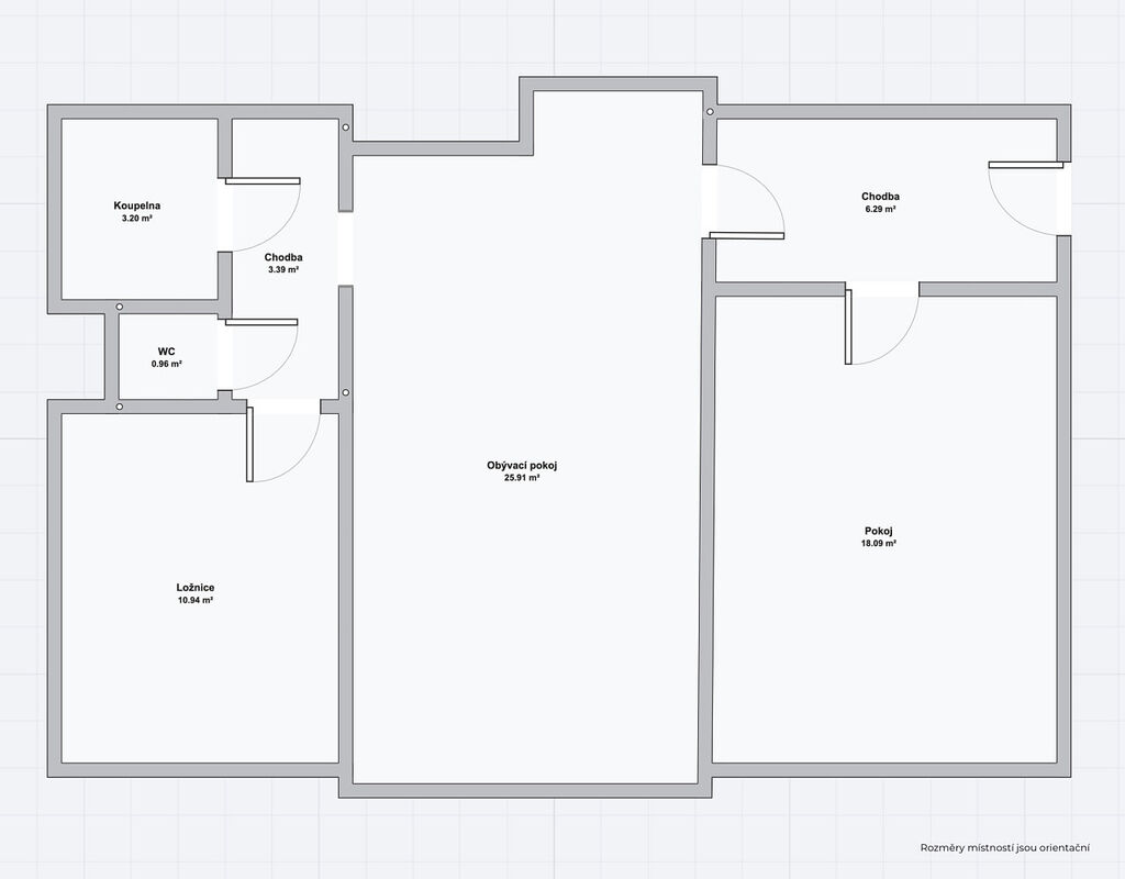 - chodby se skříněmi ma míru ~ 9,6 m²