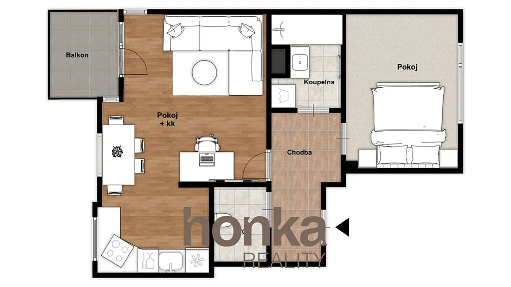 Byt je dispozičně řešen jako 2+kk a nabízí příjemný obytný prostor s dostatkem denního světla. Obývací pokoj je propojen s kuchyňským koutem a vstupem na balkon, ložnice poskytuje klidné zázemí pro odpočinek.