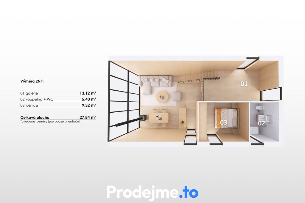 V patře o ploše 28 m2 je druhá ložnice, koupelna s vanou a toaletou a galerie využitelná k relaxaci nebo jako úložný prostor. Součástí patra je také volné místo, které lze v případě zájmu využít pro menší pokoj – dům tak může mít dispozici až 4+kk.