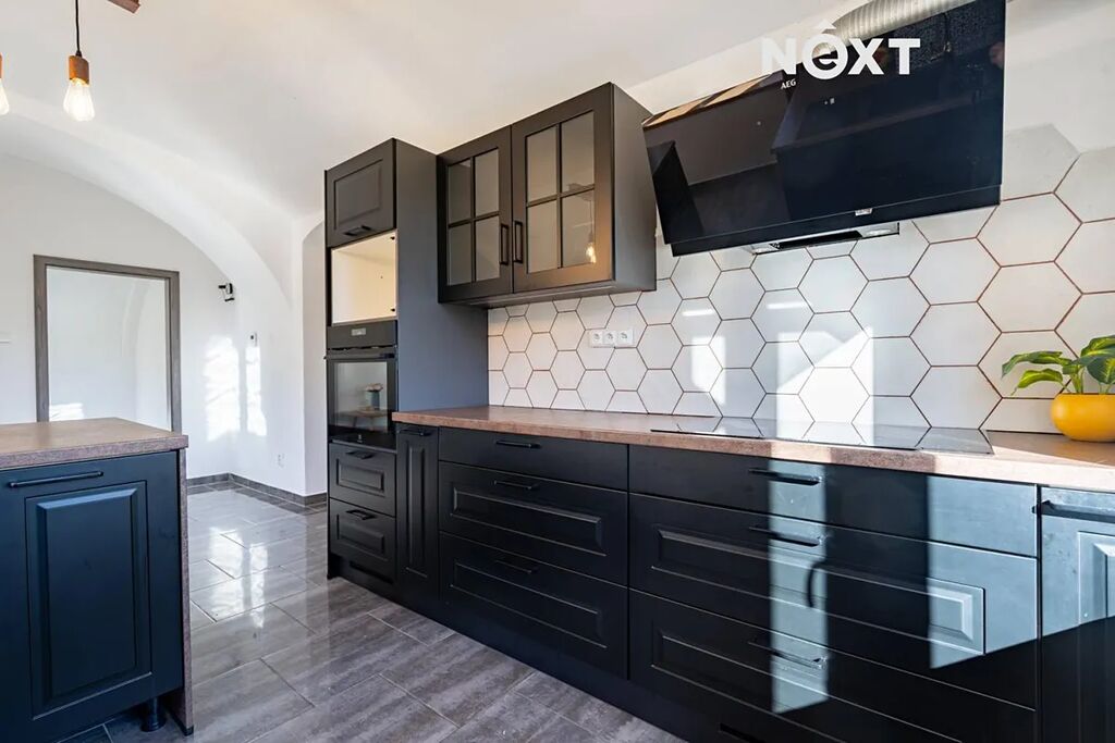 Dům je koncipován jako dvougenerační 3+KK (103 m2) a 4+KK (109 m2), tedy se dvěma samostatnými bytovými jednotkami s jedním vchodem. V přízemí se nachází velká kuchyň na míru s výhledem do zahrady a přímým vstupem na terasu, kde se počítalo s prostorem pro velkou terasu a bazén. Dále zde najdete obývací pokoj (či ložnici), jídelnu, technické zázemí, samostatné WC a koupelnu se zděným sprchovým koutem a prostorem pro pračku a sušičku. Interiér přízemí působí velmi útulně, a to i díky zachovaným klenbám, které domu dodávají charakter a eleganci.