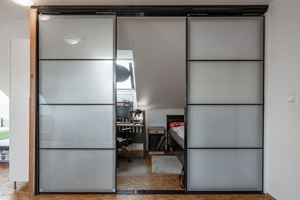 V patře se nachází dva dětské pokoje, každý s vlastní šatnou, a prostorná ložnice s dostatkem místa i pro pracovní kout. Na chodbě je pak samostatné WC.