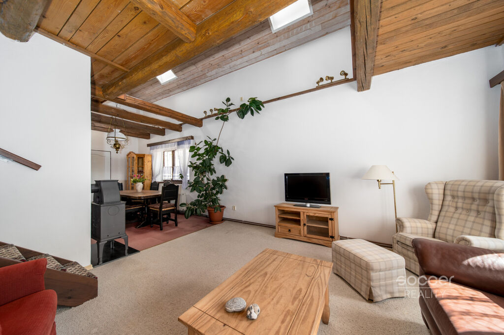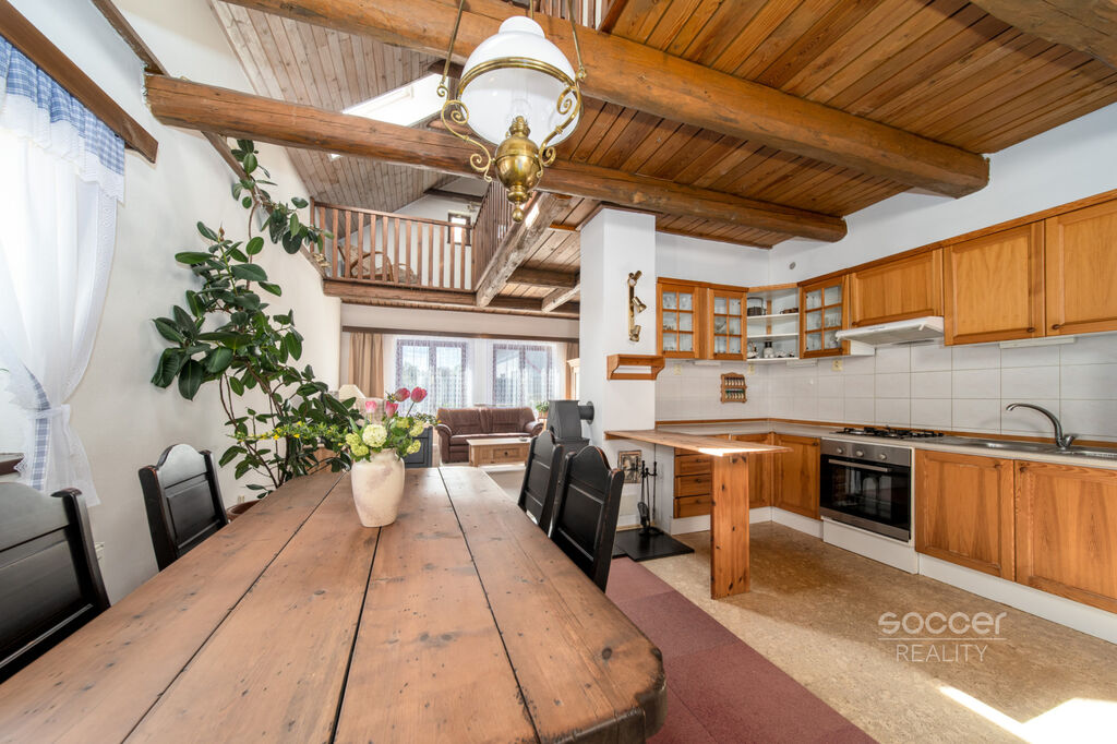 Samotný nenápadný dům vám zajistí mimořádně útulné zázemí a je vybaven stylovým nábytkem, ladícím s duchem místa. Dispozičně je řešen jako 3+kk, plus velká obytná galerie. Najdete zde také vstupní chodbu s masivním schodištěm a dvě koupelny (jednu v přízemí a druhou v podkroví). Pro individuální regulaci vytápění slouží plynový kotel. Na obytnou galerii vede schodiště také přímo z hlavního obytného pokoje s kuchyňským a jídelním koutem. Celkově interiér mile překvapí atypickým řešením a jedinečnou atmosférou.