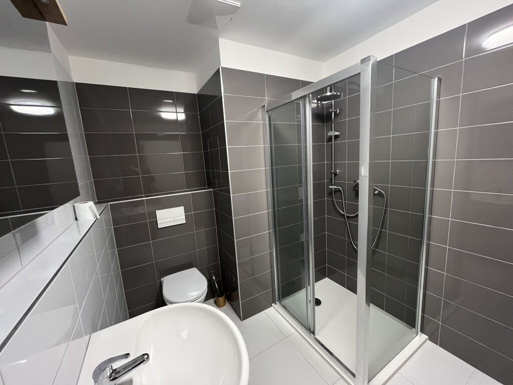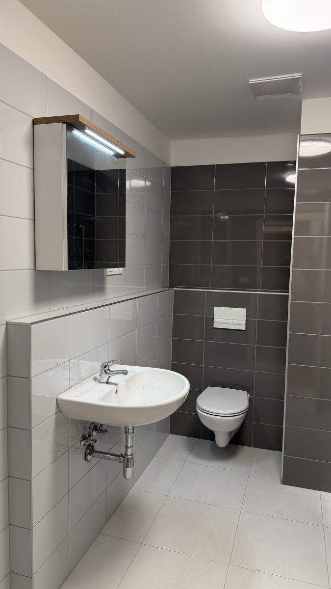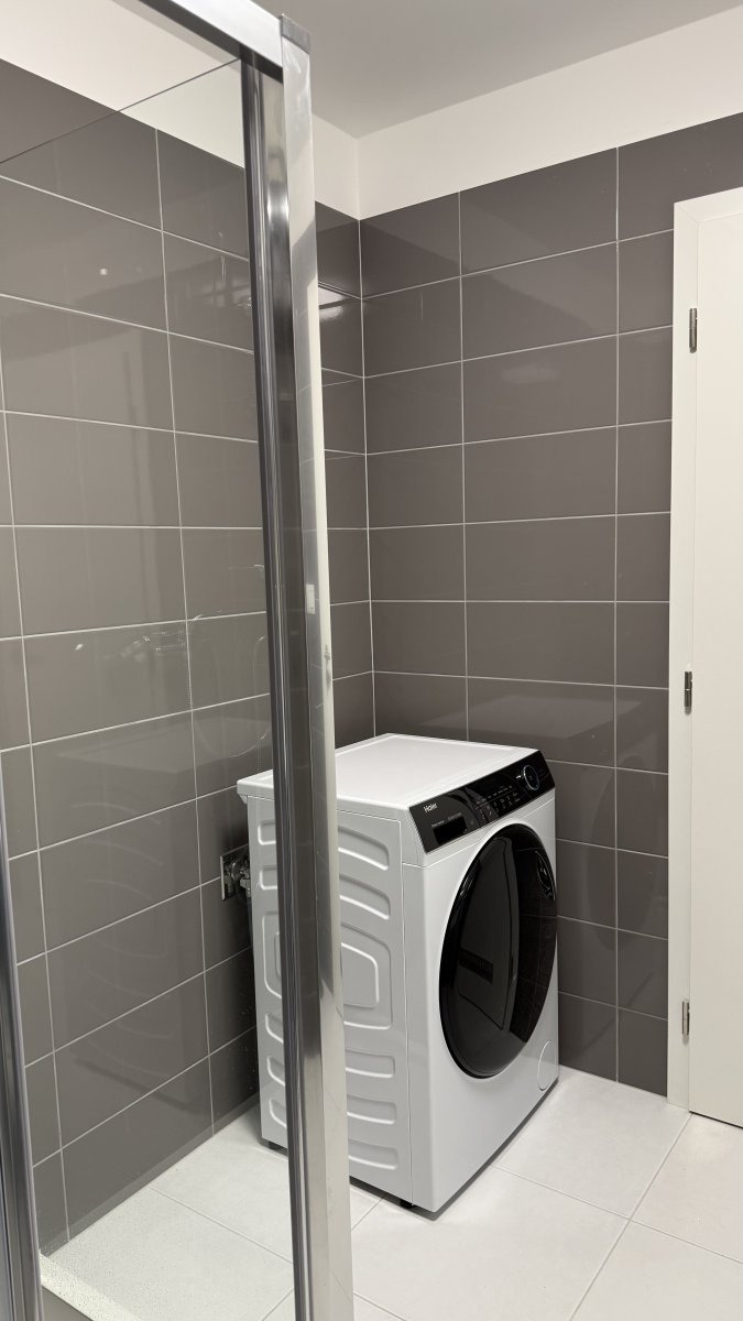 Ve vstupní chodbě se nachází velká vestavěná skříň s dostatkem úložného prostoru. Prostorná koupelna je vybavena sprchovým koutem, umyvadlem se zrcadlovou skříňkou, toaletou a pračkou.