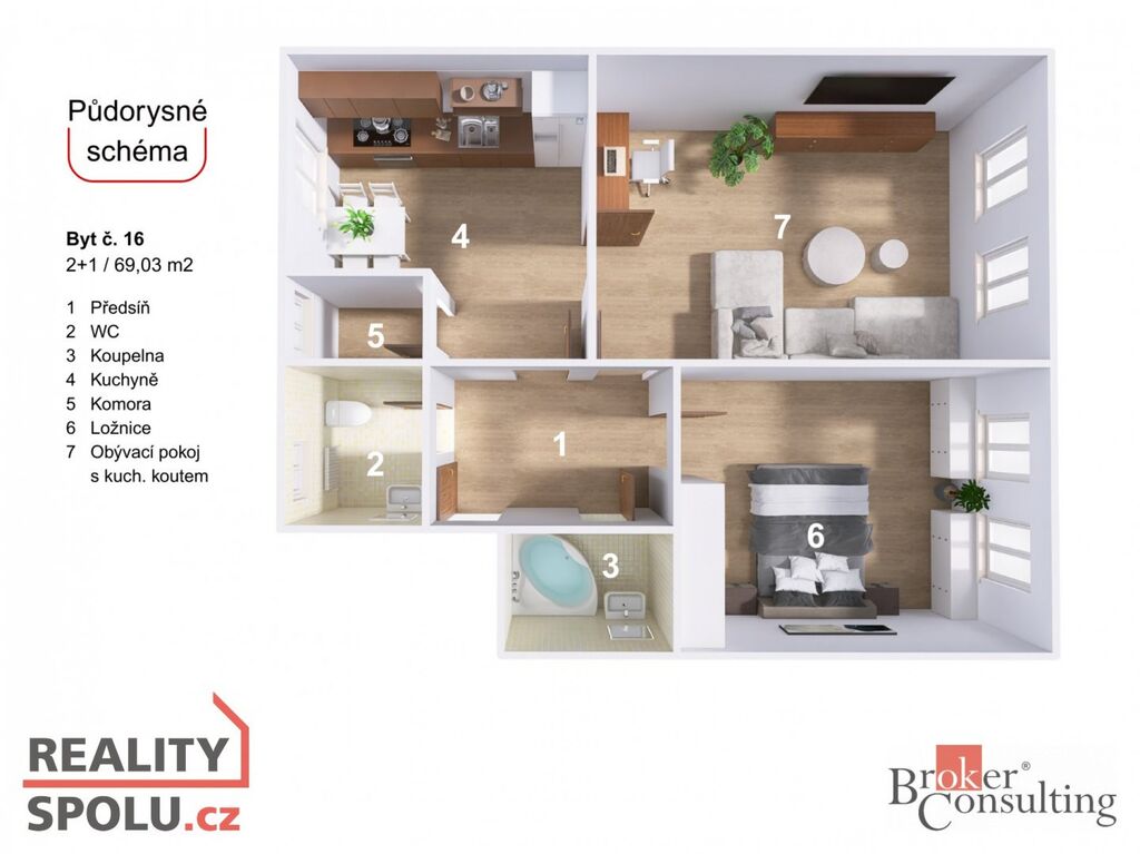Bytová jednotka se skládá ze samostatné kuchyně, prostorného obývacího pokoje a ložnice, zajišťující dostatek soukromí a klidu. Koupelna je vybavena rohovou vanou a samostatným WC, kde je dostatek prostoru pro pračku. Výhodou této bytové jednotky je praktická komora u kuchyně, kterou je možné využít jako spíž, případně úložný prostor pro další nejen kuchyňské potřeby.