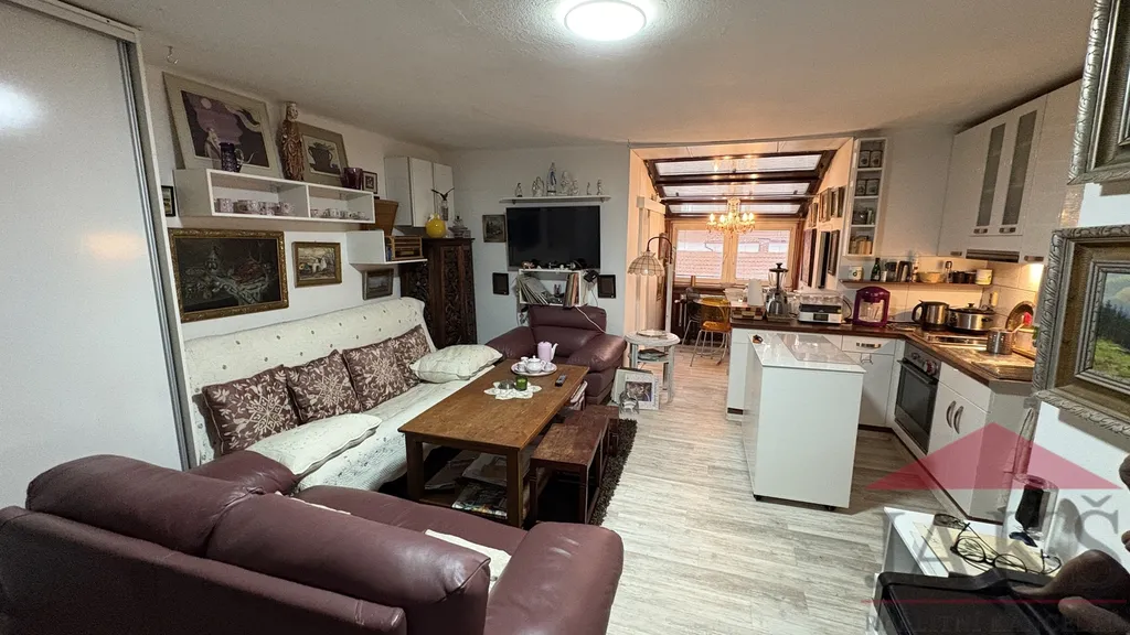 Popis: suterén (cca 60 m2): část. podsklepeno: chodba, potravinový sklep, kotelna (plynový kotel, moderní kotel na dřevo, el. boiler a vývody na pračku), koupelna (rohová vana, sprchový kout, umyvadlo se zrcadlem a skříňkou, topný žebřík a 2x WC), dvou-garáž s el. vraty; přízemí (85,9 m2): obchod: 2x prodejní místnost, chodba, schodiště (do sklepa a do podkroví), sam. WC s umyv., původní obytná kuchyň (kuch. linka s barem a vestavěnými spotřebiči: HV trouba, sklo.ker. deska, digestoř, myčka) s jídelnou, prosklený obývací pokoj (nyní vše užíváno jako prodejna) se vstupem na terasu (posezení); podkroví (49 m2): byt 3+kk: obývací pokoj s kuch. koutem (rohová kuch. linka s HV troubou a dvou-vařičem (sklo-ker.) a digestoří) se spíží, koupelna (umyv. se zrcadlem, sprchový kout, WC, průtokový ohřívač), 2x podkrovní ložnice, šatna a půdička (sklad).