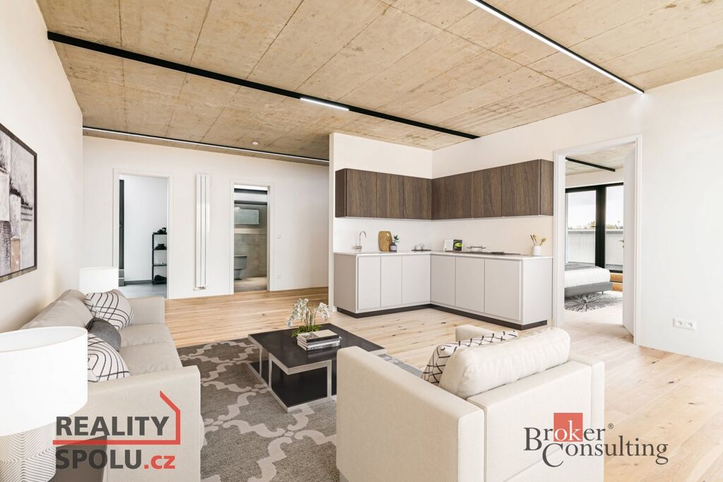 Celý byt je řešen prostornou dispozicí s industriálními stropy a perfektně prosvětleným interiérem. Západy slunce v tomto bytě opravdu stojí za to!