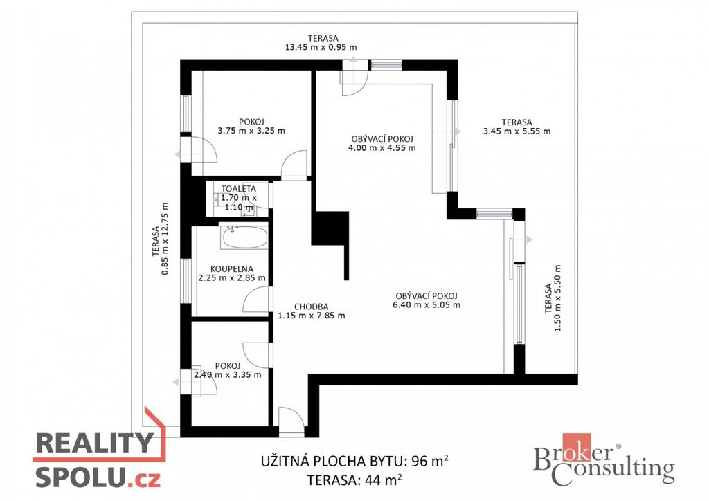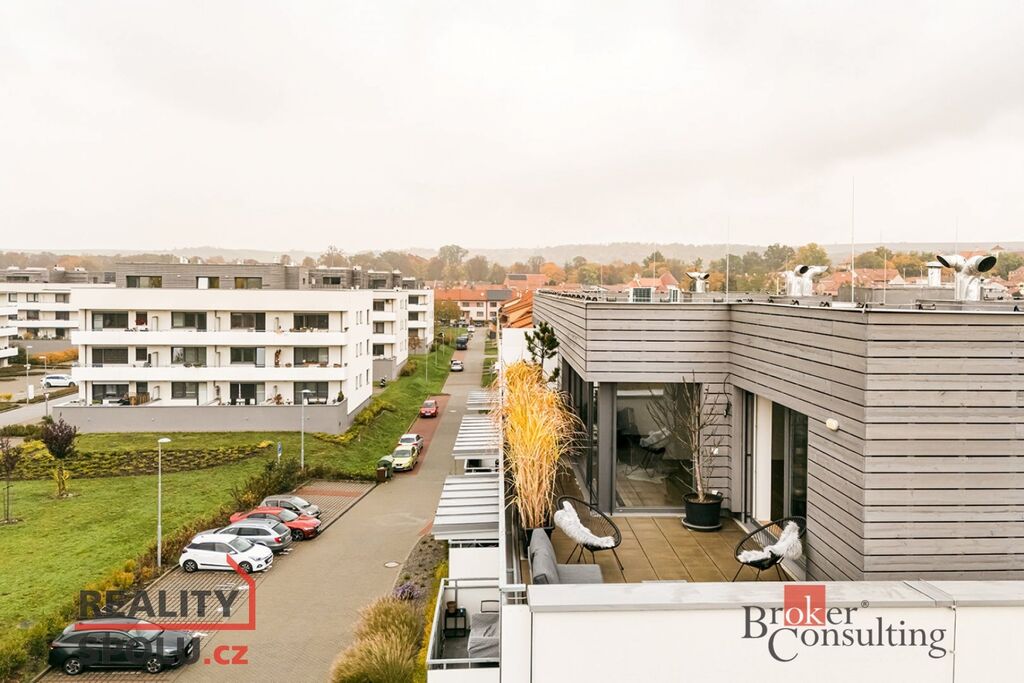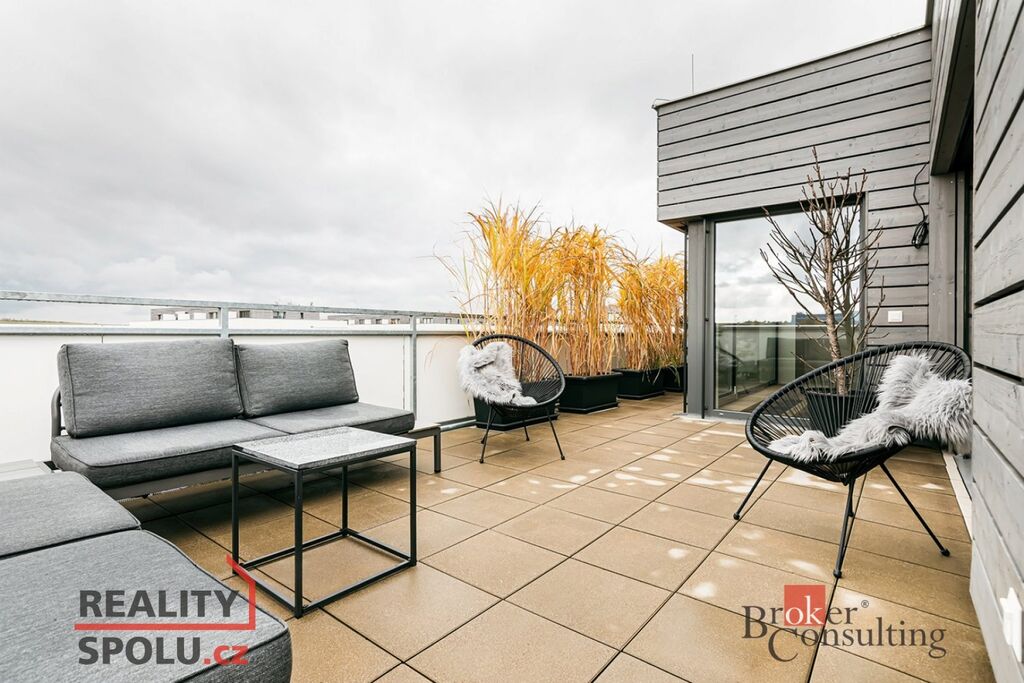 Okolo celého bytu je terasa o velikosti 44 m2, každý pokoj má tak svůj vlastní přístup. Na terase je zavedená voda a je zde i předpříprava pro markýzu.