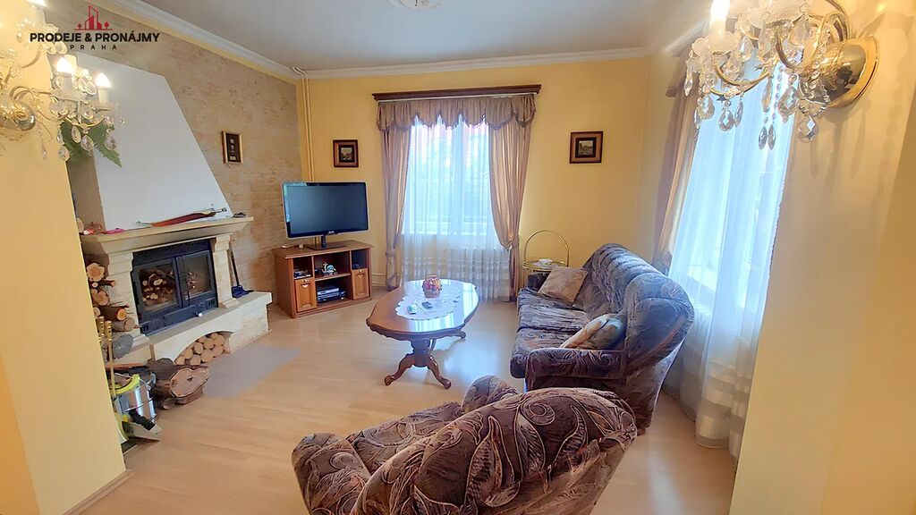 Přízemí disponuje: Pracovnou, koupelnou s vanou, samostatné WC, ložnici a prostornou obývací místnosti s funkčním krbem a vstupem do komory.