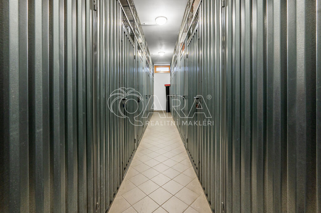 Dispozici bytu tvoří velkorysá vstupní chodba, nadstandardně velký otevřený prostor obývacího pokoje s kuchyní a vstupem na jižní terasu (7m2), ložnice se vstupem na severní zasklenou terasu (7m2), koupelna se sprchovým koutem a toaletou, komora. Součástí pronájmu je také sklep a parkovací stání v podzemních garážích.