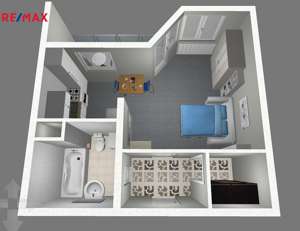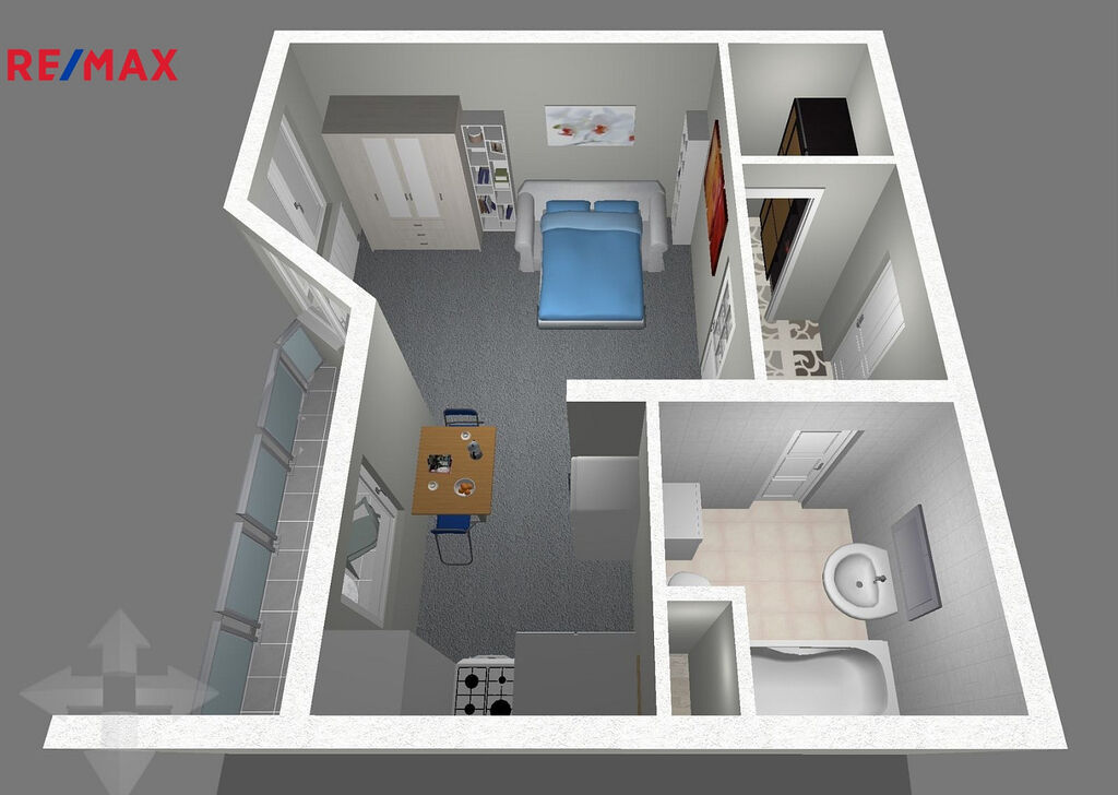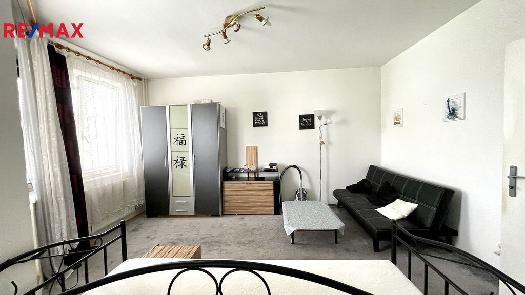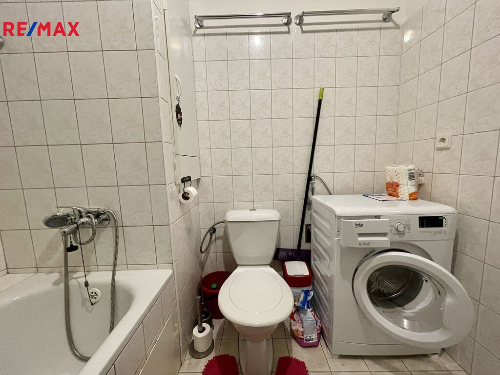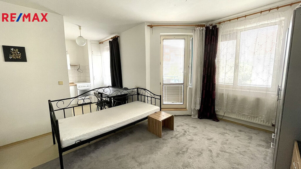 Pěkný, čistě vymalovaný byt se nachází ve 4. np v domě o 6 np. Kromě prostorného pokoje, který je propojen s kuchyní, je v bytě větší chodba s prostorem pro šatnu a koupelna s wc. Z pokoje se vchází na rozměrnou lodžii. Ve stejném podlaží se nachází i místnost o výměře 5m², která slouží jako sklep.