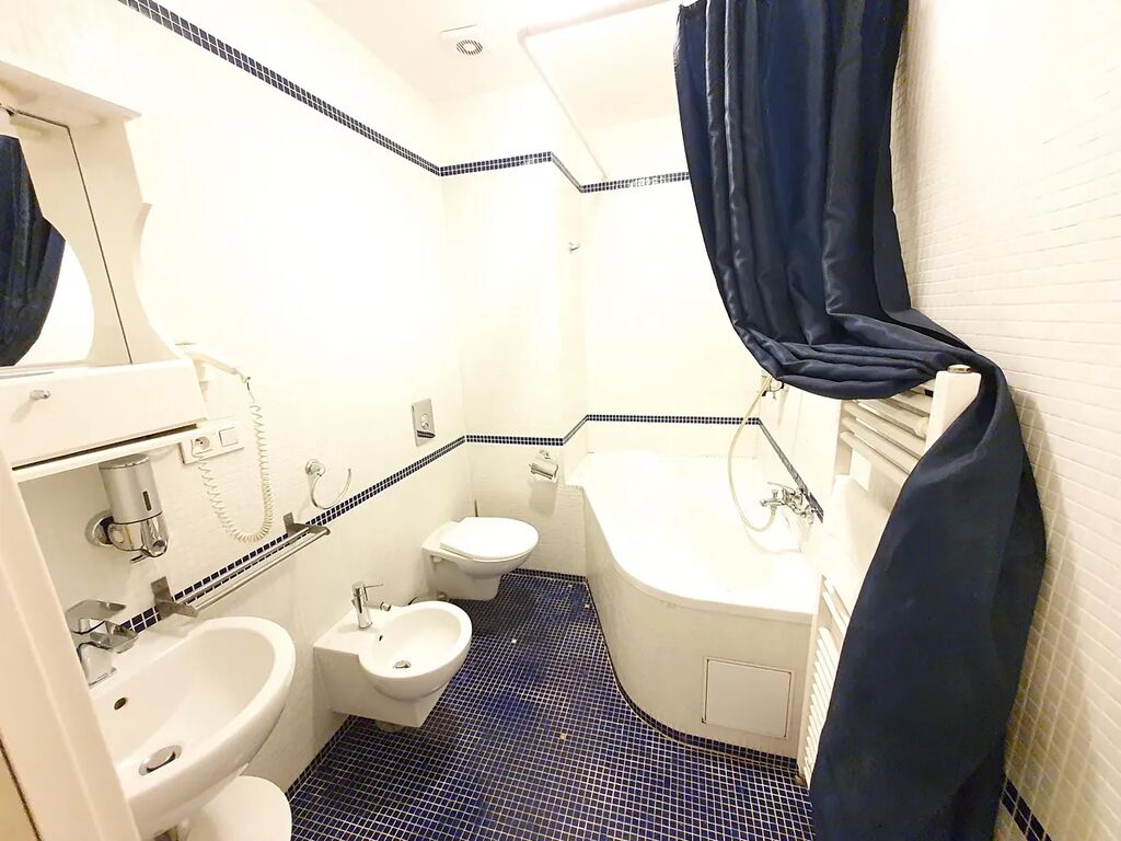 Pěkný vybavený byt 2+kk 43 m2, Praha 1 - Nové Město, v obývacím pokoji rozkládací sedačka, kuchyňská linka, koupelna s vanou.
