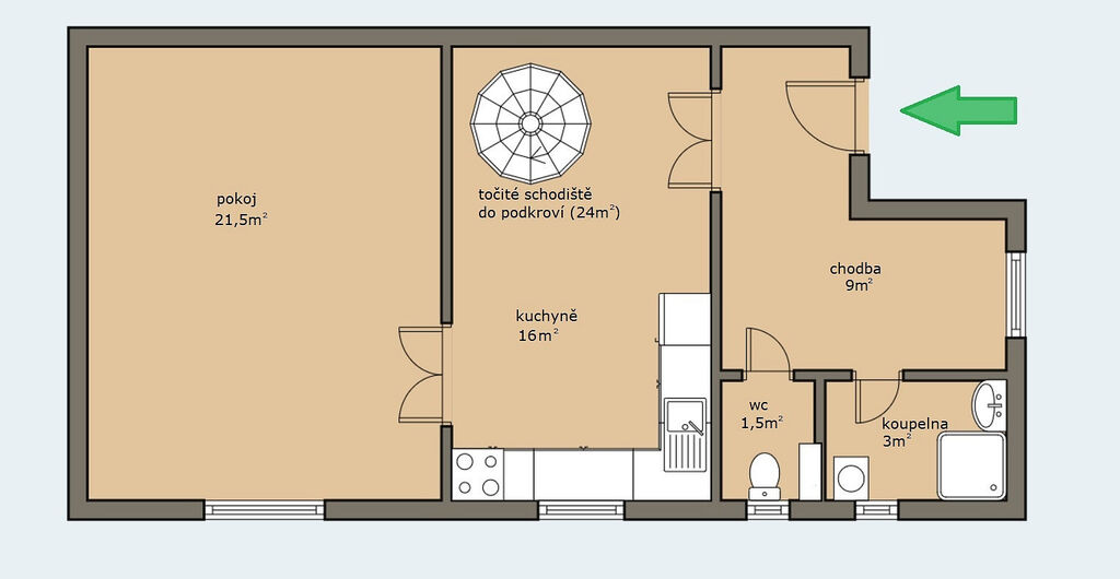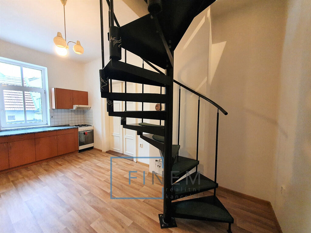 Byt má velmi příjemné uspořádání. Ve spodním patře se nachází velká vstupní chodba s okny do ulice, koupelna se sprchovým koutem, samostatná toaleta a kuchyň s kompletně novou kuchyňskou linkou včetně spotřebičů, vyměněnou v létě 2024. Z kuchyně je přímý vstup do rozlehlého obývacího pokoje nebo na točité schody vedoucí do podkroví. V patře se nachází prostorná ložnice, která díky svému umístění poskytuje dostatek soukromí.