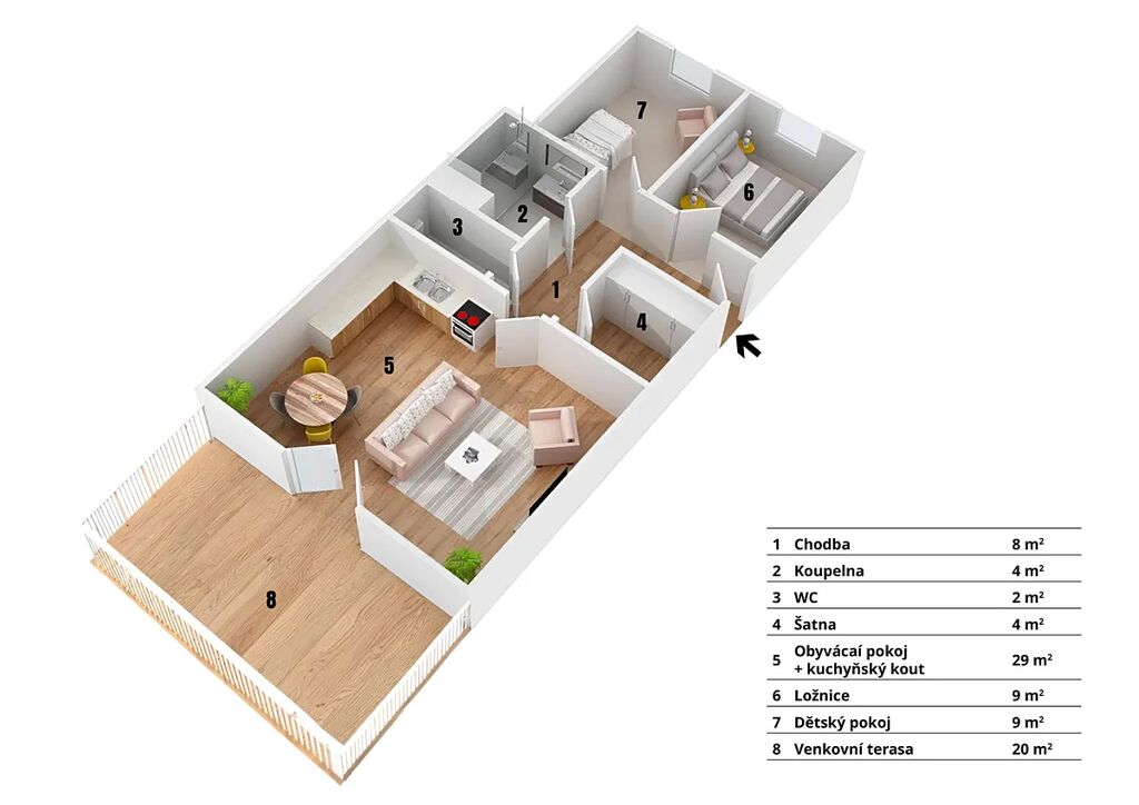 - byt je orientovaný na sever, terasa na jih.