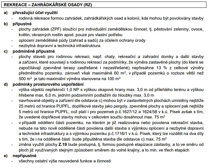 Z hlediska územního plánu se jedná o stavební pozemek v zastavěném území obce, v ploše s funkčním využitím "RZ" (Rekreace - zahrádkářské osady) a lze na něm vystavět dům o půdorysné ploše do 90m2 s výškou hřebene do 6m. V této osadě je již postaveno několik celoročně obyvatelných zděných domů.