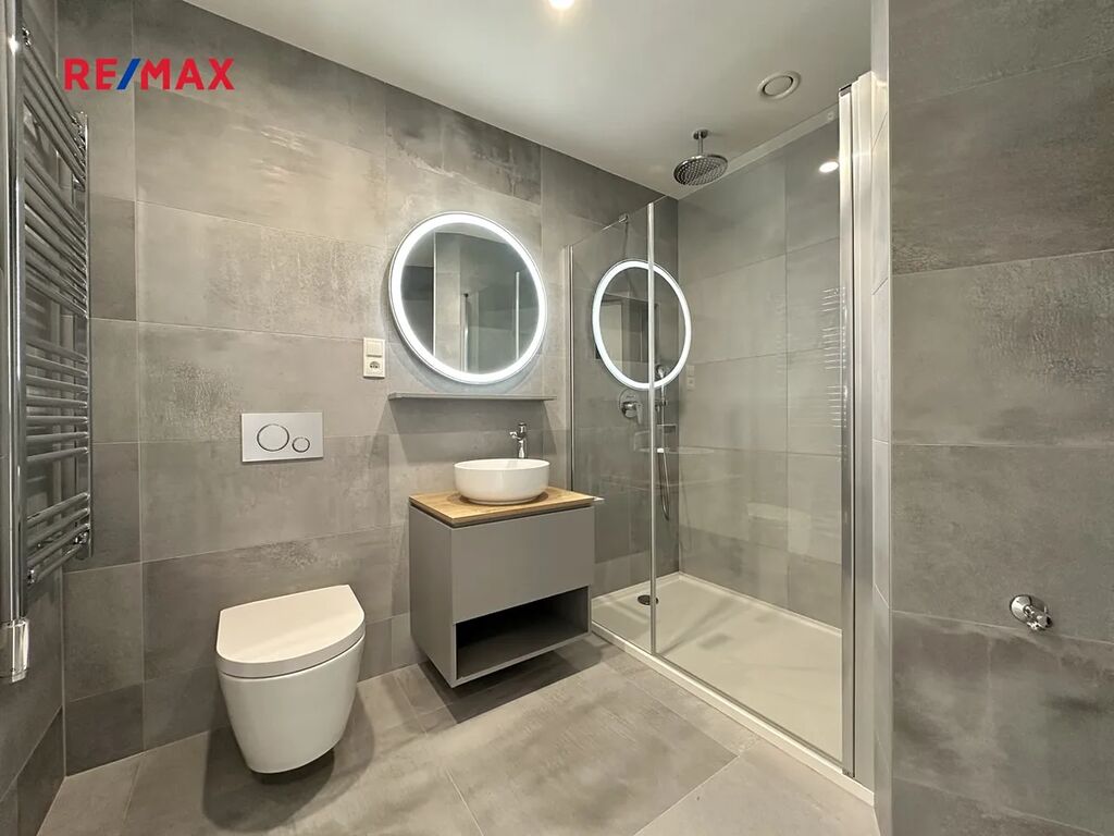 Hlavní místnost nabízí plně vybavenou kuchyň - myčka nádobí, indukční varná deska, digestoř, horkovzdušná pečící trouba, mikrovlnná trouba, lednice s mrazničkou, vše doplněno dostatkem úložného a pracovního prostoru. Dále jsou k dispozici prostorné skříně v předsíni i v ložnici. V obytných místnostech je dřevěná podlaha, v koupelně a na chodbě dlažba a celý byt je vybaven podlahovým vytápěním. Elegantní koupelna nabízí sprchový kout, umyvadlo, toaletu, topný žebříček, přípravu pro pračku/sušičku a úložnou skřínku pod umyvadlem. Velkoformátová okna s trojskly jsou doplněna přípravou pro zavěšení záclon a závěsů. Vstupní dveře jsou bezpečnostní (třída 3) a vnitřní dveře Hörmann mají nadstandardní výšku 210 cm.