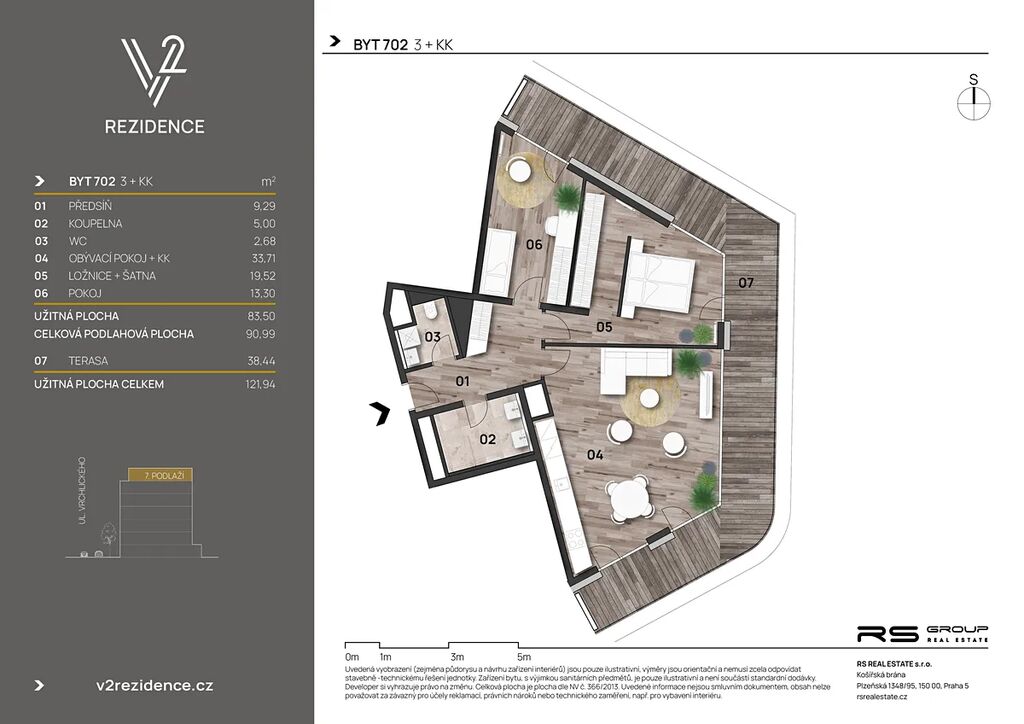 Nabízený byt o dispozici 3+kk a velikosti 91 m² (bez terasy) je umístěn v nejvyšším 7. patře. Jeho součástí je prostorná terasa o velikosti 38,44 m², která je orientovaná na tři světové strany (S,V,J). Můžete si tak zde užívat ranní kávu i večerní posezení u vína s rodinou nebo přáteli. K bytu je možné dokoupit sklepní kóji a parkovací stání (cena není zahrnuta do ceny inzerátu).