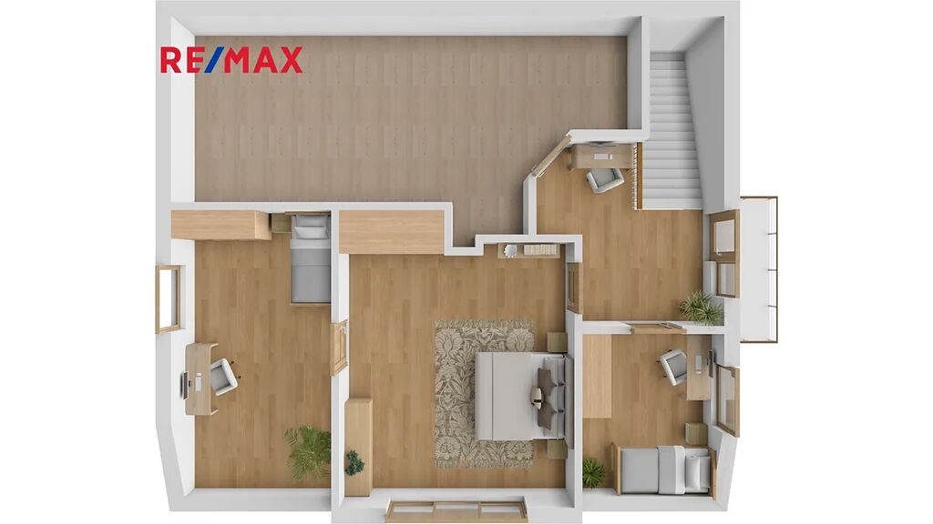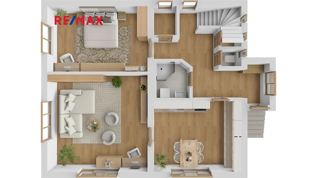 V přízemí domu je velká kuchyně, obývací pokoj a ložnice, dále koupelna a WC. V podkroví se pak nachází tři pokoje a velká půda, kde je potenciál na vybudování další místnosti.