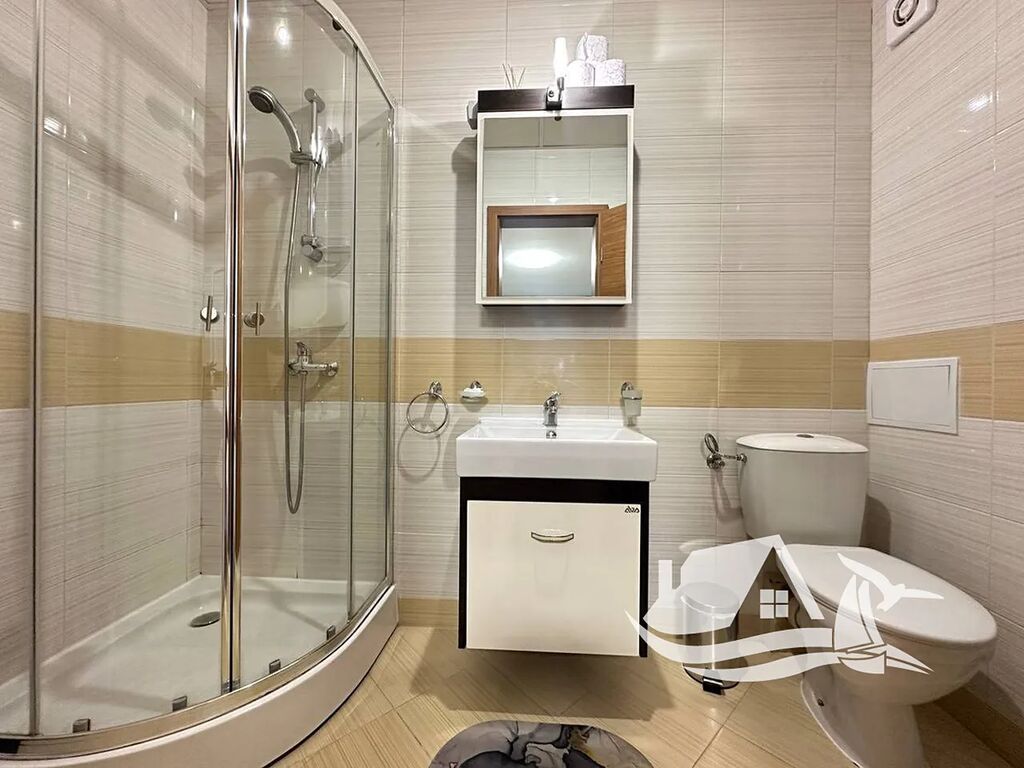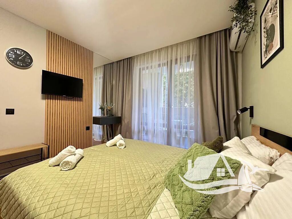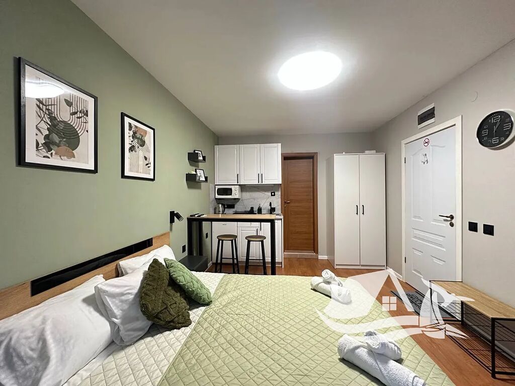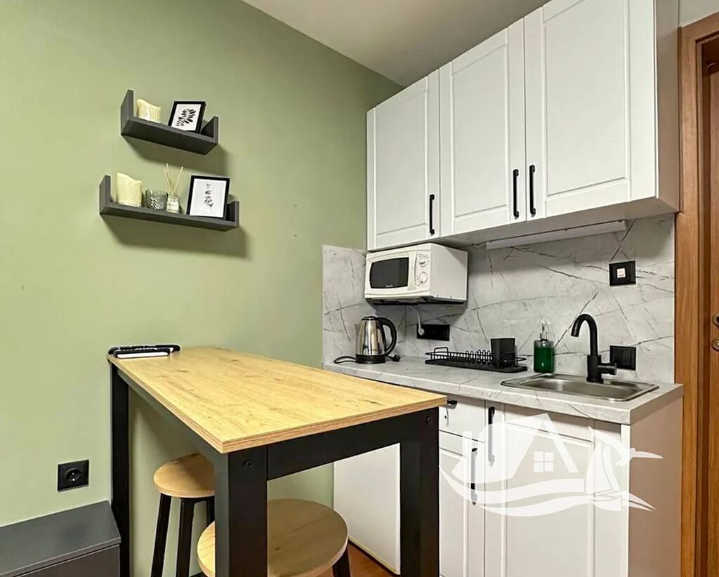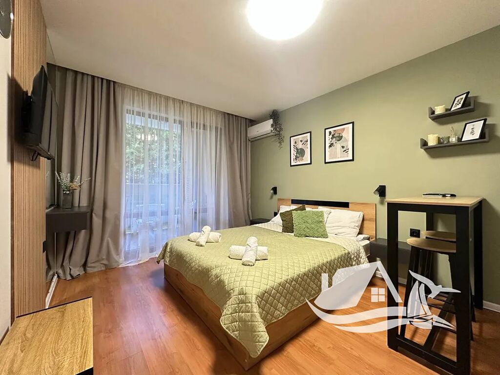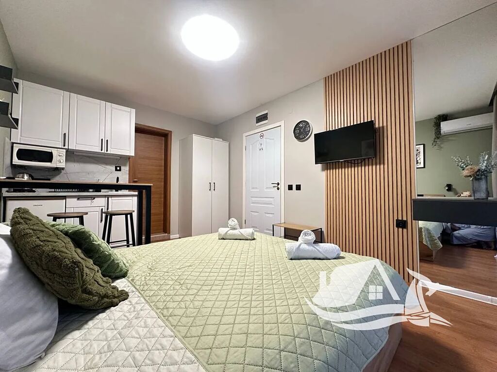 Toto stylové studio o ploše 34 m² se nachází v přízemí prestižního komplexu Prestige Fort Beach, přímo u moře ve Sveti Vlasu. Apartmán prošel kompletní renovací a je připravený k okamžitému nastěhování. Interiér působí svěže a harmonicky – příjemné zelené tóny, promyšlené zónování prostoru a kvalitní vybavení vytvářejí útulnou atmosféru. Kuchyňská část je chytře oddělena od obytné zóny elegantním barem, který navozuje pocit skutečného domova.