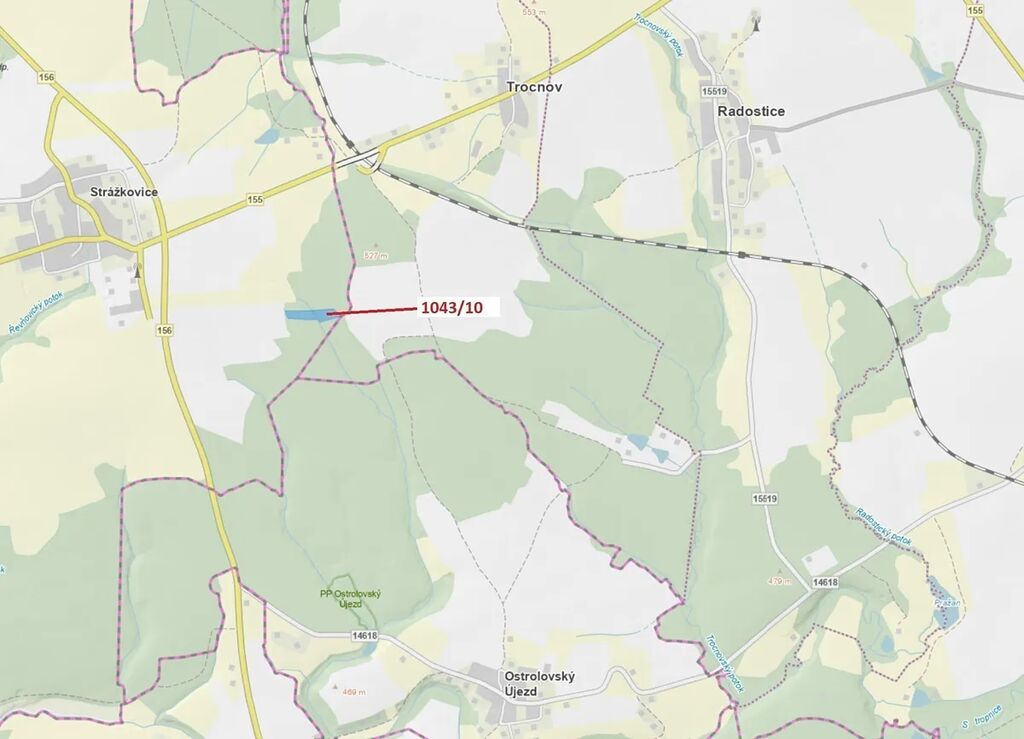 Lesní pozemek o výměře 11 078 m2, parcelní číslo 1043/10, podíl 1/1, katastrální území Strážkovice, obec Strážkovice, obec s rozšířenou působností České Budějovice, okres České Budějovice, Jihočeský kraj. Částečně po těžbě.